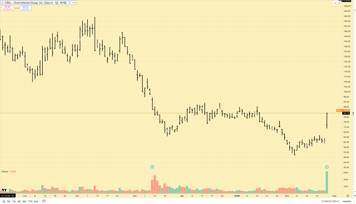 Компания отчиталась за четвёртый квартал и 2025 год. Отчетные данные сильные, превзошли ожидания аналитиков и рынок. В ответ акции уже выросли более чем на 30%. Итак: - Q4 Revenue: $770 млн (+77% г/г), выше ожиданий аналитиков; - USDC в обращении: ~ $75.3 млрд (+72% г/г); - Он-чейн объём транзакций USDC: ~ $11.9 трлн (+247% г/г); - Чистая прибыль в Q4: ~$133 млн (значительно выше предыдущего года); - Полный год 2025: выручка и доход от резервов ~$2.7 млрд (+64% г/г). 👍 Рост выручки и объёмов транзакций значительно превзошёл прогнозы — это редкость в текущем криптоцикле. USDC продолжает расширяться, его доля на рынке и активность увеличиваются — это основной драйвер финансовых показателей.Компания предоставила ориентиры роста, включая целевой долгосрочный CAGR ~40% для USDC. Развитие инфраструктурных продуктов (платежная сеть, тестнет Arc и др.) потенциально расширяет бизнес за пределы простого выпуска стейблкоина. Регуляторная поддержка в США создания федеральной инфраструктуры для ст