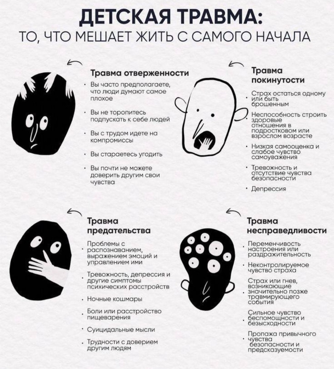 Травмы отверженности, покинутости, предательства и несправедливости проявляются в отношениях, карьере и самооценке. Давайте разберём их причины: