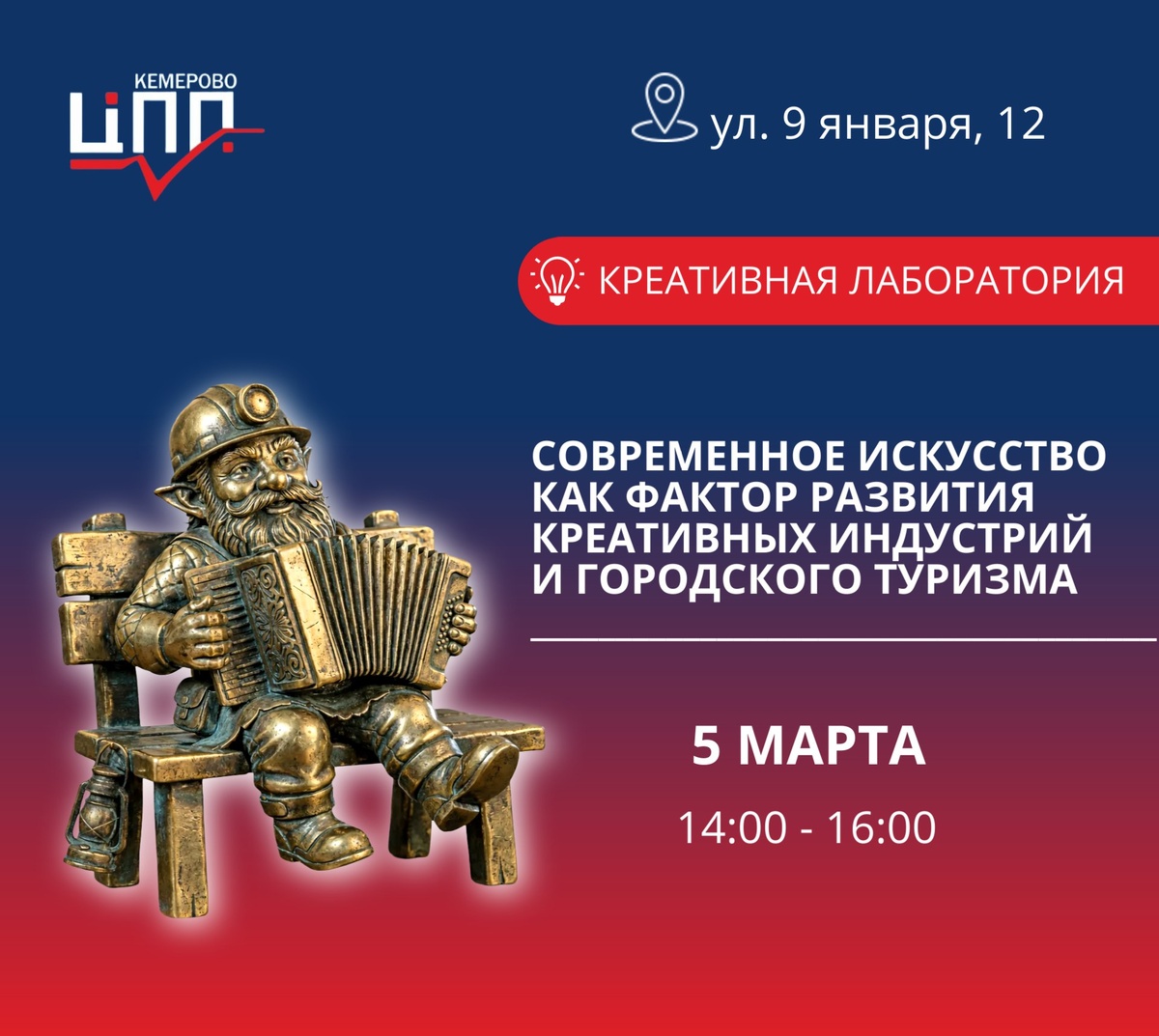 ! Еще не отпустили последние морозы февраля, а мы все больше мечтаем о летних маршрутах и экскурсиях по городу Кемерово! ⚡️Уже 5 марта пройдет креативная лаборатория «Современное искусство как фактор развития креативных индустрий и городского туризма» В креативной лаборатории примут участие авторы паблик-арт проекта «Шахтерское братство», эксперты, краеведы, представители культурных институций, бизнеса. ⁉️Что это будет? Вы узнаете уже через неделю, присоединяйтесь к диалогу. ⏰5 марта в 14:00 – 16:00 📍9 Января, 12, Центр поддержки предпринимательства #Мероприятия_ЦПП #Креативная_лаборатория
