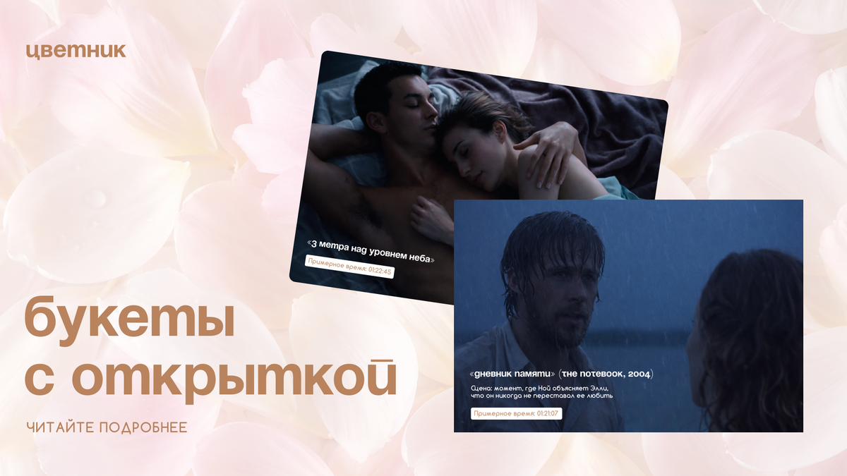 В эпоху, когда любую фразу можно сгенерировать нейросетью, а стандартные открытки из супермаркетов стали признаком дежурного внимания, на первый план выходит индивидуальность и контекст. Новый тренд — тайм-код из фильма на карточке к букету — захватил соцсети и сердца людей. Рассказываем, как пара цифр на бумаге может заменить тысячи слов! Механика подарка до гениальности проста, но невероятно эффектна. К вашему букету крепится лаконичная, стильная карточка. На ней нет пишут название культового фильма и точный таймкод (минуты и секунды). Девушка получает цветы, видит цифры, открывает фильм на указанном времени и слышит фразу или видит сцену, которая отражает ваши чувства к ней. Такая открытка создает эффект квеста и интриги. Получательница не сразу понимает суть послания, а момент ожидания, пока загружается видео, создает мощный эмоциональный подъем. Чтобы вам не пришлось тратить часы на пересмотр мелодрам, мы в собрали целый список тайм-кодов, которые гарантированно вызывают мурашки.