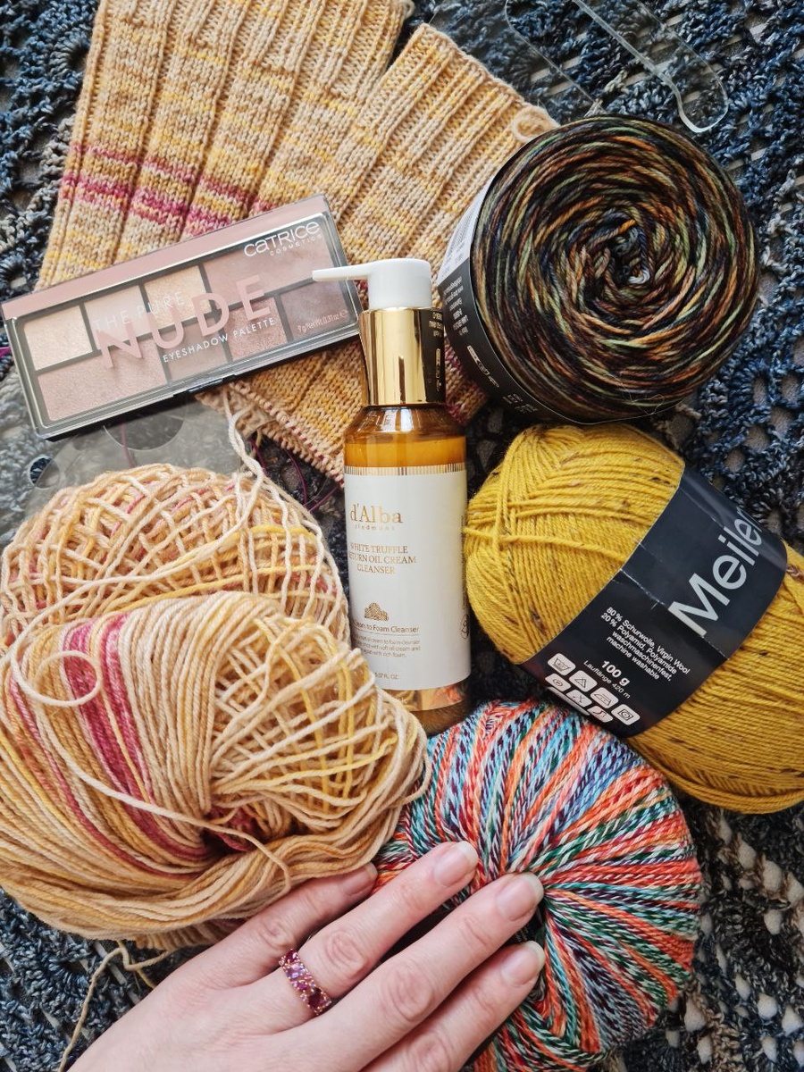 ! Значит так! Новинка от Lana grossa Sooty, color 16866226! На фото, как и в карточки продавца проглядываются горчичные ноты, из-за которых я и захотела этот цвет! Так вот! Его там нет! Камера так выстветляет, вживую цвета в зеленую гамму, так что горчичный Meilenweit tweed в качестве компаньона в пролете! Но он и так прекрасен! Люблю горчицу, хоть она мне и не идет! Вторым номером идет Lang wool addicts, который все уже связали, а я все никак! Пряжа демисезонная, для жарких людей и на осень и весну. Состав 45% хлопок, 42% шерсть и 13% полиамида для износостойкости. Солнечные мужские носки по МК Екатерины Москатовой @me_mosk вяжутся, а фон законченная шаль! Я ее постирала и она теперь очень даже ничего! Мне нравится! И мои рекомендации масло-пенка от d'Alba, просто нежнейшая💛 и палетка теней Catrice the pure nude. Тени не отдают в рыжий, что важно для белокожих девушек! Вот я вам тут понаписала! Читайте!😄