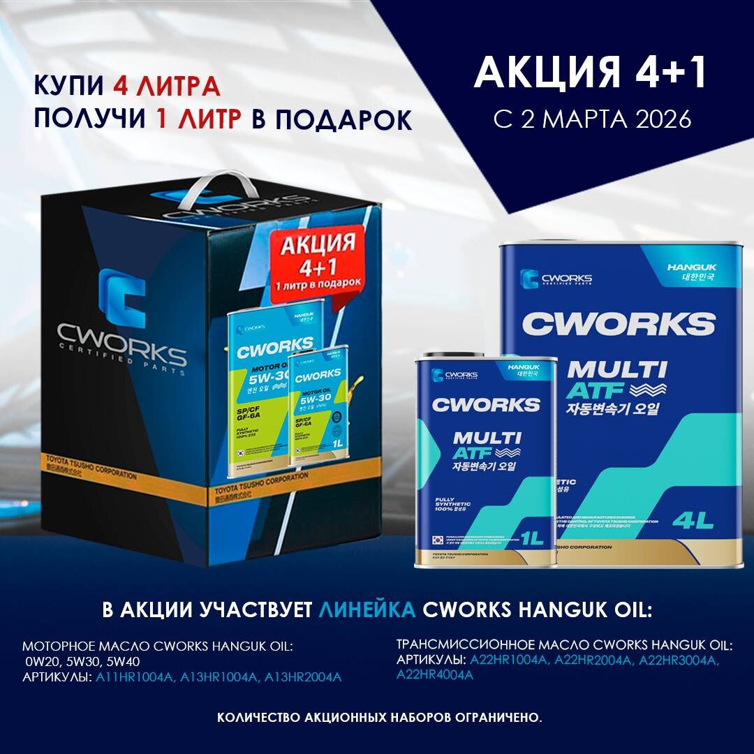 ! Покупайте канистры в специальной упаковке 4L+1L и получайте 1 литр в подарок к 4 литрам моторного или трансмиссионного масла. 📅 Старт: 02.03.2026 📍 Маркетплейсы, интернет-магазины, розница, СТО и официальные партнёры. 🔎 С полным перечнем официальных партнёров CWORKS вы можете ознакомиться на официальном сайте в разделе «ГДЕ КУПИТЬ». ⚡ Количество наборов ограничено — успейте воспользоваться выгодой!