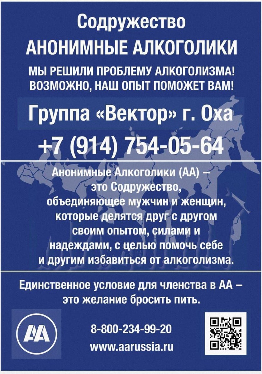 Место проведения: ЦРБ, административный корпус, актовый зал. Участие анонимное и бесплатное. Списки участников не ведутся, личная информация никому не передаётся, в том числе медицинскому персоналу и в наркологическую службу. Сообщество не поддерживает религиозные течения и не является сектой. Трезвость — это путь, который можно пройти вместе. Актуальную информацию можно уточнить по телефону: 8 914 754-05-64.
