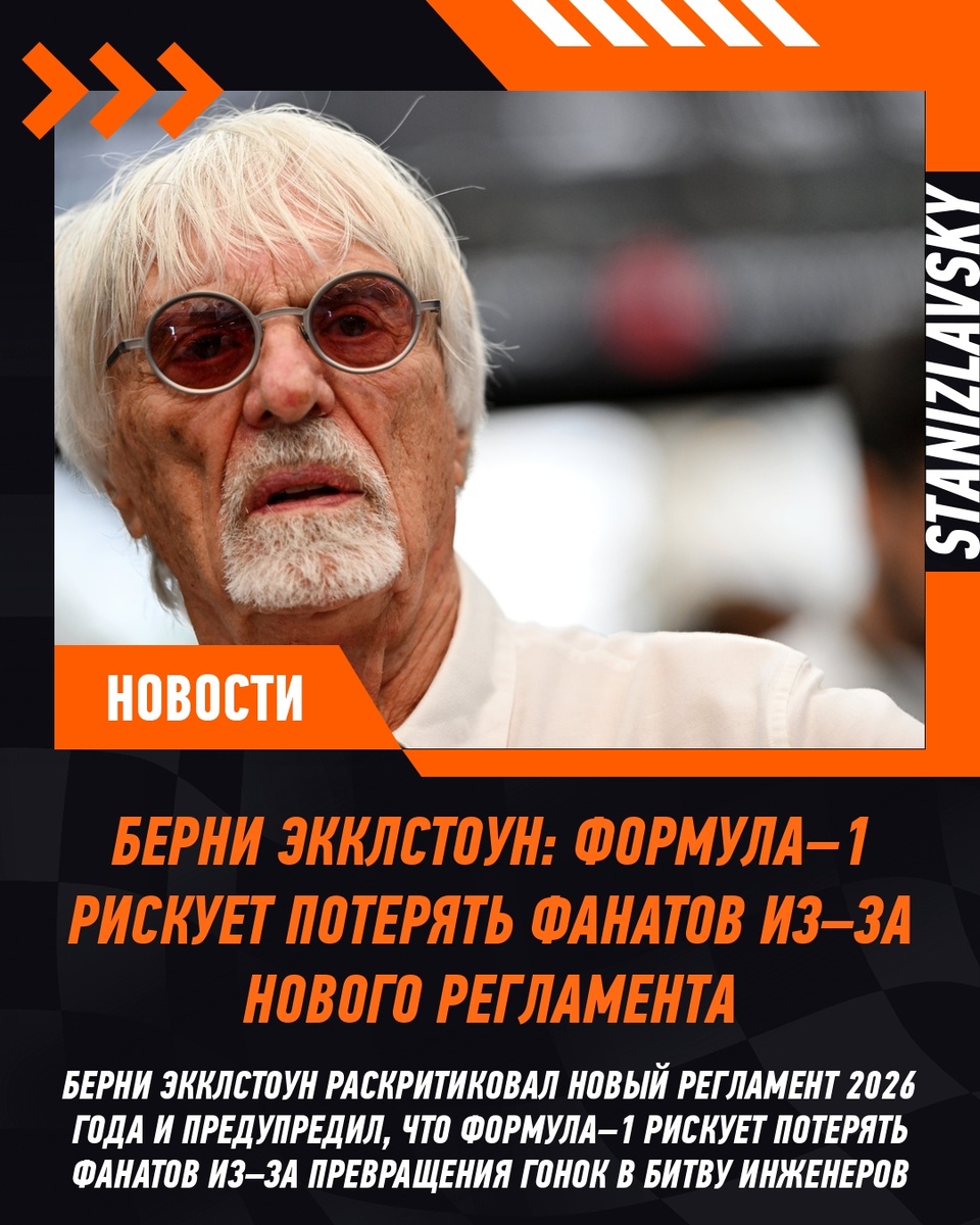 ⚠️ Бывший глава Ф1 Берни Экклстоун поддержал опасения чемпиона: «В начале сезона начнется неразбериха, ведь всем придется заново учиться Формуле–1. Новые правила явно не подходят стилю Макса. Гонки отходят на второй план: всё диктует регламент – делай это, не делай того. ДНК серии в том, что это чемпионат для пилотов, а не для инженеров. Сейчас Формула–1 начинает конкурировать с Формулой–E. Возможно, кому–то это и нравится, но я сомневаюсь. Есть риск, что мы потеряем фанатов, и я искренне надеюсь, что ошибаюсь».