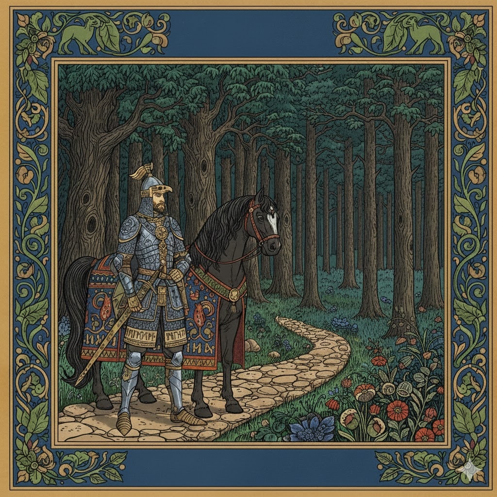 Взял он коня богатырского под уздцы и в лес пошёл. Долго рыцарь по лесу блуждал, лишь на третий день к избушке вышел. А как ближе подошел, тут дверь и открылась. И вышла на крыльцо мрачная, худая, страшная старуха.