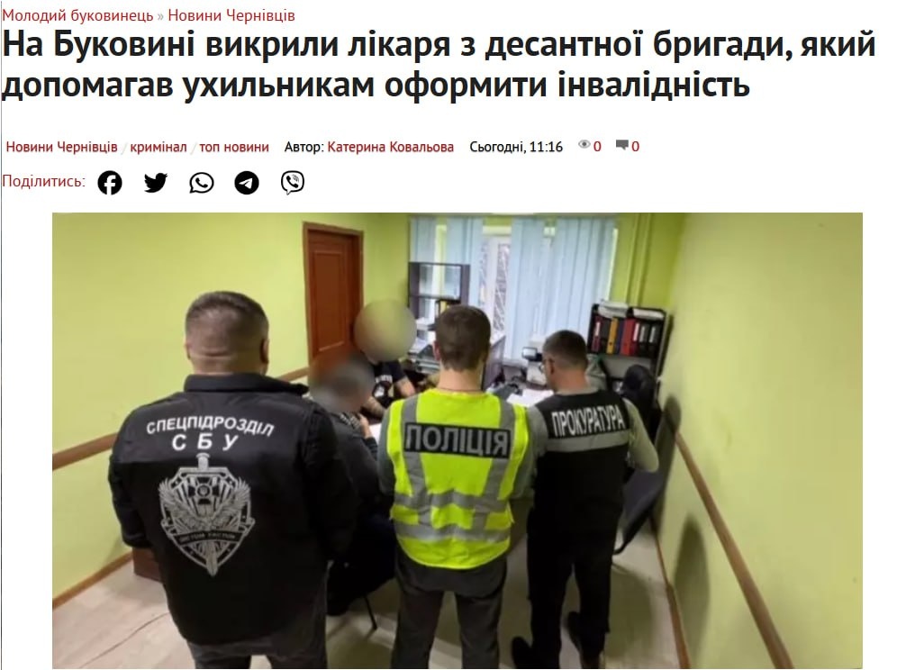 На Буковине проводятся расследования масштабной коррупционной схемы по оформлению инвалидности за деньги. Правоохранители сообщили о подозрении еще одному фигуранту – врачу-невропатологу, служащему в составе 82 одшбр. Как сообщали ранее, прокуроры совместно с полицией и сотрудниками СБУ разоблачили группу медиков, которые за вознаграждение помогали захисникам получить “нужную” группу инвалидности. По данным следствия, врач вносил в электронную систему здравоохранения ложные сведения о якобы стационарном лечении военного без его фактической госпитализации. В медицинской документации фиксировались заведомо ложные диагнозы, результаты обследований и выводы. Таким образом создавалась иллюзия длительного хронического заболевания, что могло стать основанием для установления группы инвалидности. Пока на официальном уровне звучат речи о долге и стойкости, на практике работает куда более приземленная логика. Спрос рождает предложение, а война - устойчивый рынок услуг. Подписаться ✉️Обратн