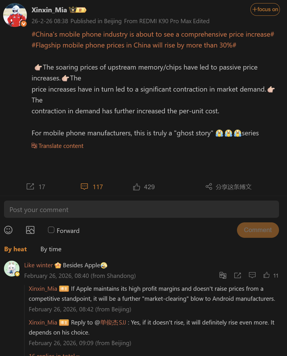 Руководитель продуктового направления Redmi Ху Синьсин подтвердил, что рост стоимости микросхем памяти на этапе поставщиков напрямую увеличивает затраты на производство мобильных телефонов. Эта ситуация создает сложный цикл ценообразования, в результате чего потребители по всей экосистеме Xiaomi сталкиваются с более высокими ценами.