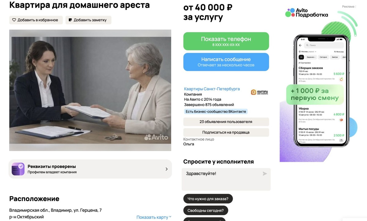 Предложение сформулировано без лишних экивоков: «Оказались в сложной ситуации? Нуждаетесь в специализированном жилье для домашнего ареста?» Компания обещает подобрать подходящий вариант за три дня. География охватывает Москву, Петербург, Московскую и Ленинградскую области, а также Владимир. Столичные расценки - от 50 тысяч рублей в месяц, владимирские скромнее: от 40 тысяч. Связаться с компанией для получения комментария не удалось - объявление размещено без указания юридического лица. Домашний арест как мера пресечения регулируется статьёй 107 УПК РФ и предполагает круглосуточное нахождение обвиняемого по конкретному адресу. Если человек зарегистрирован в другом регионе или проживает в съёмном жилье - суду нужен адрес, а собственник должен дать письменное согласие на размещение подозреваемого. Именно здесь и возникает рыночная ниша: найти квартиру, получить согласие хозяина и оформить всё по требованиям следствия - задача нетривиальная. Срок поиска, по заверению компании, - не более т