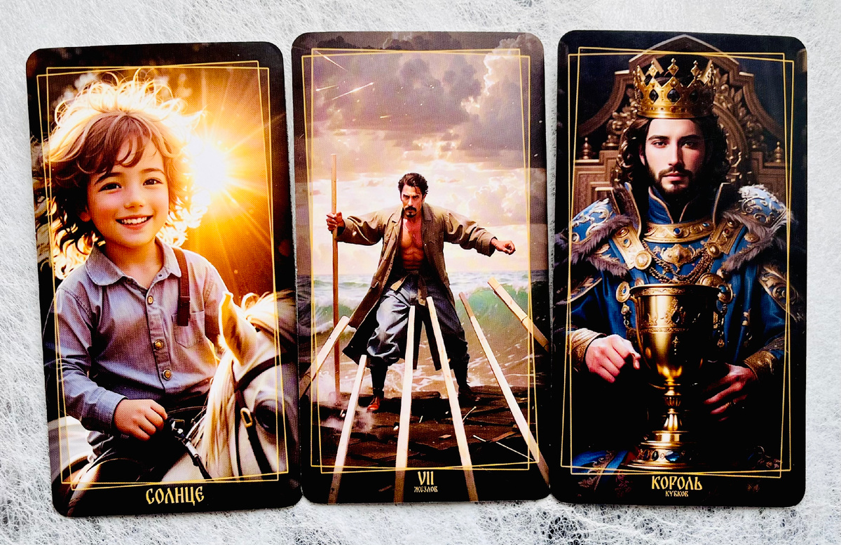 Что происходит сейчас между вами? Честно говоря, карты удивили. С таким набором энергий странно, что у вас еще есть какие-то сомнения насчет этого человека - любит, однозначно. Король кубков с Солнцем - это сильные, яркие чувства со стороны мужчины, любовь буквально озарила его жизнь. Диагноз однозначен: любит вас крепко, всей душой. Но тут не все гладко. Есть аркан, блокирующий поток. 7 жезлов - это сопротивление пространства, некая ситуация, препятствие, оно застопорило всю динамику. Внешне создается впечатление, что это испытание для двоих. На самом деле, это отражение внутренних блоков, глубинных бессознательных страхов. Это не значит, что вы не нужны мужчине - нужны, но одновременно с этим он способен спрятаться за проблемы, чтобы выждать паузу. Да, проблемы есть. И понятно, почему он не может высказать все, что у него на душе. Хотя, положа руку на сердце, вы знаете правду. Слишком все очевидно. Вы знаете, что он к вам чувствует. Но, похоже, что этого мало. Часто по 7 жезлов