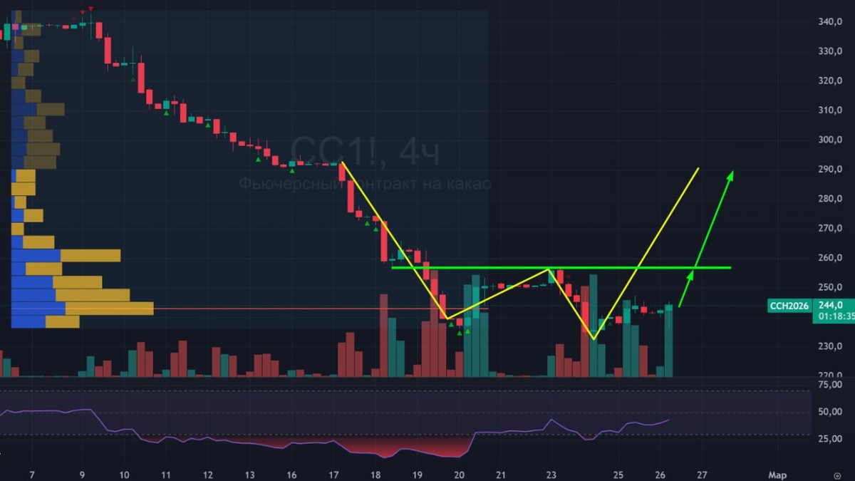 ☕️ Какао 🟢 Сегодня зачерпнули короткие стопы и показали снова хороший объем. Выглядит уже не первый день перспективно. Важной целью является зеленая линия - 256,0. Только преодолев её можно будет говорить о том, что тут начинается бычка. Пока что до этого уровня не дотянулись, но возможно мы в процессе заправки. 🚗 Остаюсь какао-быком, сидящем в просадке. Жду формирование разворота. Перспектива есть, посмотрим, не сломают ли её! #какао #cc1 #cocoa #bogdanoffinvest $CCH6 $CCJ6