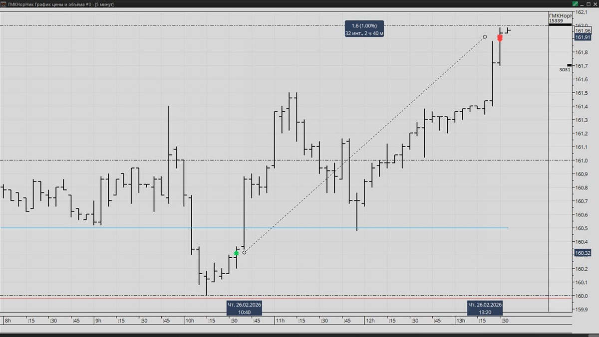 ▫️ ГМК +1% 📈 Точка входа ( отбой ) 💰 Риск | Прибыль ( 1к 5 ) Красная линия на графике показывает где поставил стоп ! 🥳 Поздравляю всех, кто заработал !!! #сделки