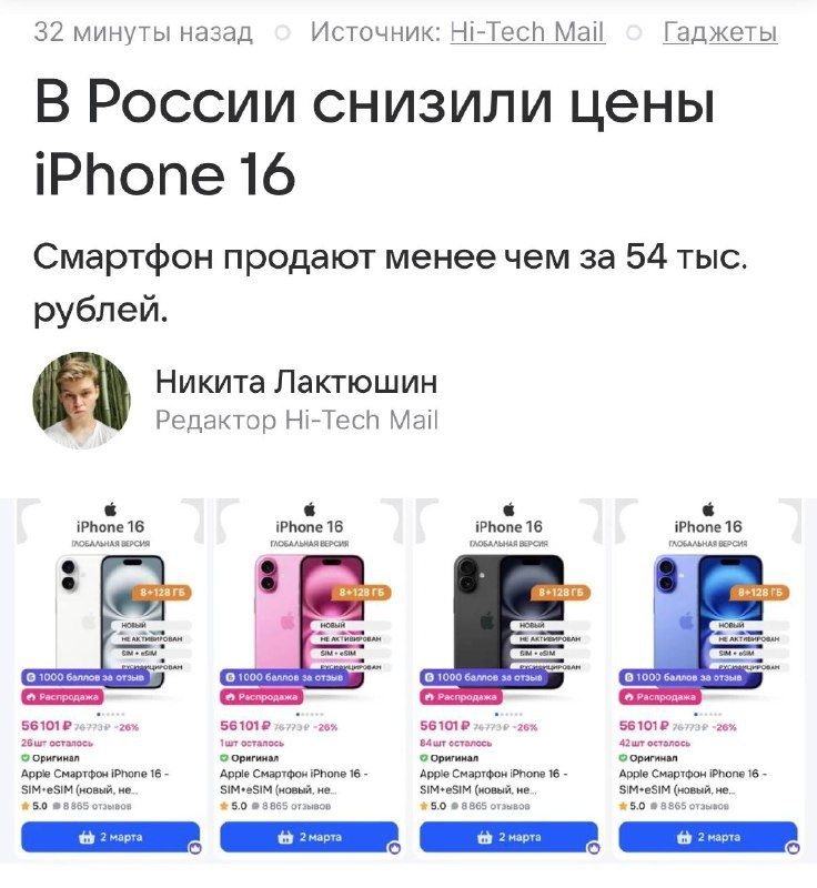 ❗️iPhone 16 внезапно просел в цене — базовую версию в России уже можно найти примерно за 54 тысячи рублей
