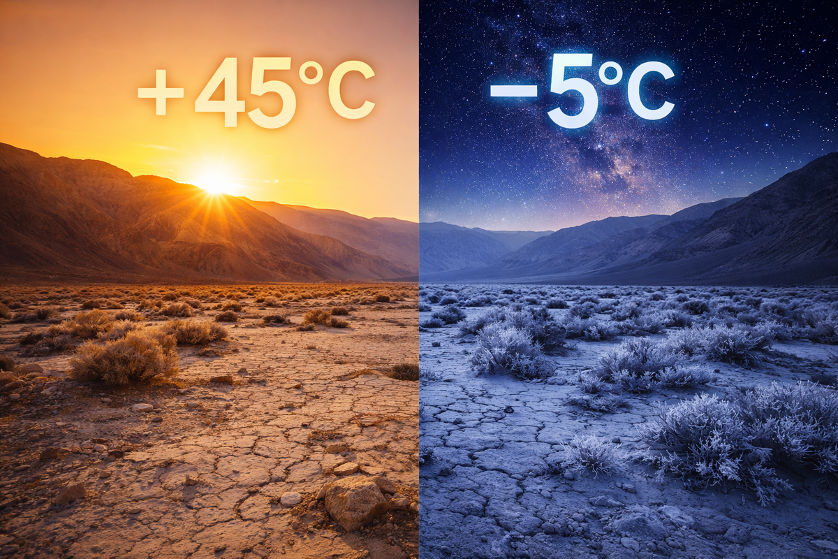Дополнительный эффект создаёт низкая теплоёмкость песчаных и каменистых грунтов. Они быстро нагреваются днём, но так же быстро остывают ночью. В отличие от воды или влажной почвы, здесь нет значительного накопления тепловой энергии. Поверхность словно мгновенно переключается из режима нагрева в режим охлаждения. Это усиливает суточный контраст. Разница в десятки градусов становится нормой.