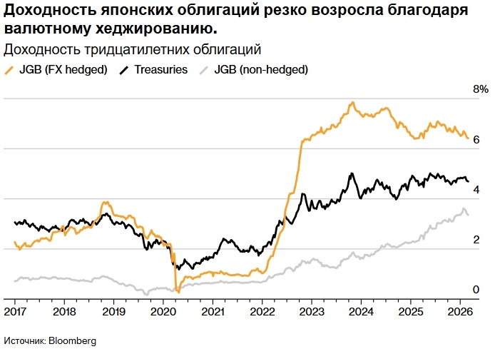 Государственные облигации Японии могут предложить доходность около 6% для инвесторов, готовых вложить средства в долгосрочные долговые обязательства и использующих доллары в качестве инвестиционного инструмента. Инвесторы могут заработать около 4% на доходности долгосрочных японских облигаций и получить еще 2% за счет хеджирования валютного курса. Доходность 20- и 30-летних японских облигаций выше, чем у аналогичных казначейских облигаций, но существуют и риски, в том числе более низкая ликвидность долгосрочных долговых обязательств и гораздо большая волатильность торгов. BlackRock Inc. считает, что нынешняя ситуация в Японии предоставляет инвесторам, готовым вкладываться в долгосрочные долговые обязательства в долларах, уникальную возможность получить доходность до 6%. Эксперты компании называют эти условия «золотым веком» для инвестиций. Навин Сайгал, глава отдела глобальных облигаций BlackRock в Азиатско-Тихоокеанском регионе, сообщил в интервью Bloomberg TV, что доходность долгосро