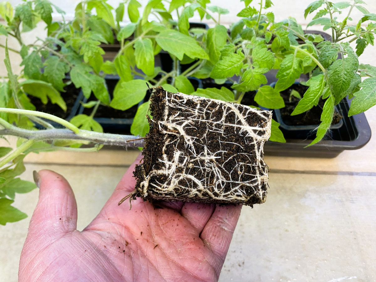 Если вы увидели, что рассада томатов желтит нижними листьями, то обязательно вытащите саженец из стакана и посмотрите на корни. Уверена, что вы увидите плотно обвитый корневой ком, который буквально кричит о том, что ему срочно нужен бОльший объем горшка и питание. Томаты прожорливы, а мы далеко не всегда вспоминаем, что подкармливать нужно каждую неделю. Пропускаем раз-два и в итоге сами ослабляем свои растения. Поэтому добавляем сыпучие комплексные удобрения уже на этапе второй перевалки! Это решит все проблемы с питанием для рассады. При перевалке стараюсь заглубить саженец по максимуму, потому что на той части стебля, что окажется под землей – появятся новые корни и растение станет сильнее и крепче. ☝️ Если добавили комплекс – то больше ничем не подкармливаем! В нем содержится все, что нужно для роста и развития. NPK 13:12:18 плюс магний, кальций и другие микроэлементы. Действие пролонгированное, до 2 месяцев. Как раз хватит до высадки на грядки. А на грядках этот же комплекс прекр