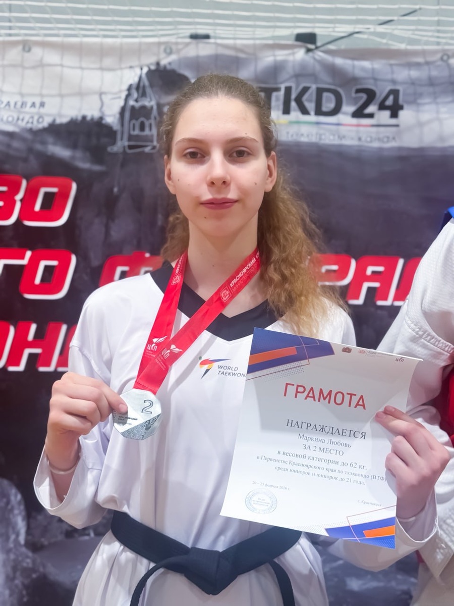 ! В Красноярске прошло первенство Красноярского края по тхэквондо среди юниоров и юниорок до 21 года. Любовь Маркина завоевала серебряную медаль в весовой категории до 62 кг! Поздравляем спортсменку и её тренера-преподавателя с этим замечательным достижением! Также желаем Любови Маркиной и Александру Кишечкину успехов на первенстве Сибирского Федерального округа, которое состоится уже в эти выходные в Барнауле.