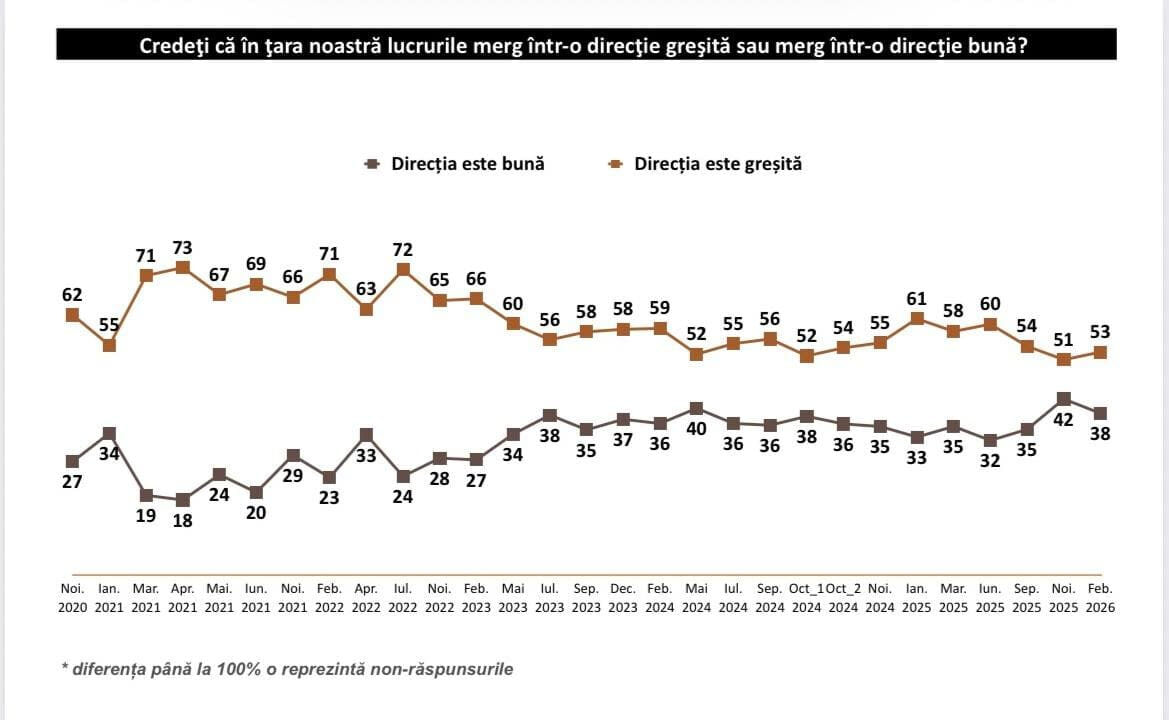 📊53% опрошенных жителей Молдовы считают, что страна движется в неправильном направлении – таковы данные опроса IMAS за февраль 2026 года. По сравнению с концом 2025 года, после прошедших парламентских выборов, этот показатель вырос (тогда был 51%). 38% опрошенных уверены, что курс выбран верно, но общий фон остаётся стабильным и скорее пессимистичным. Почти половина респондентов недовольны своей жизнью, а на улучшение в ближайший год надеются лишь 30%. @eNewsmd.online
