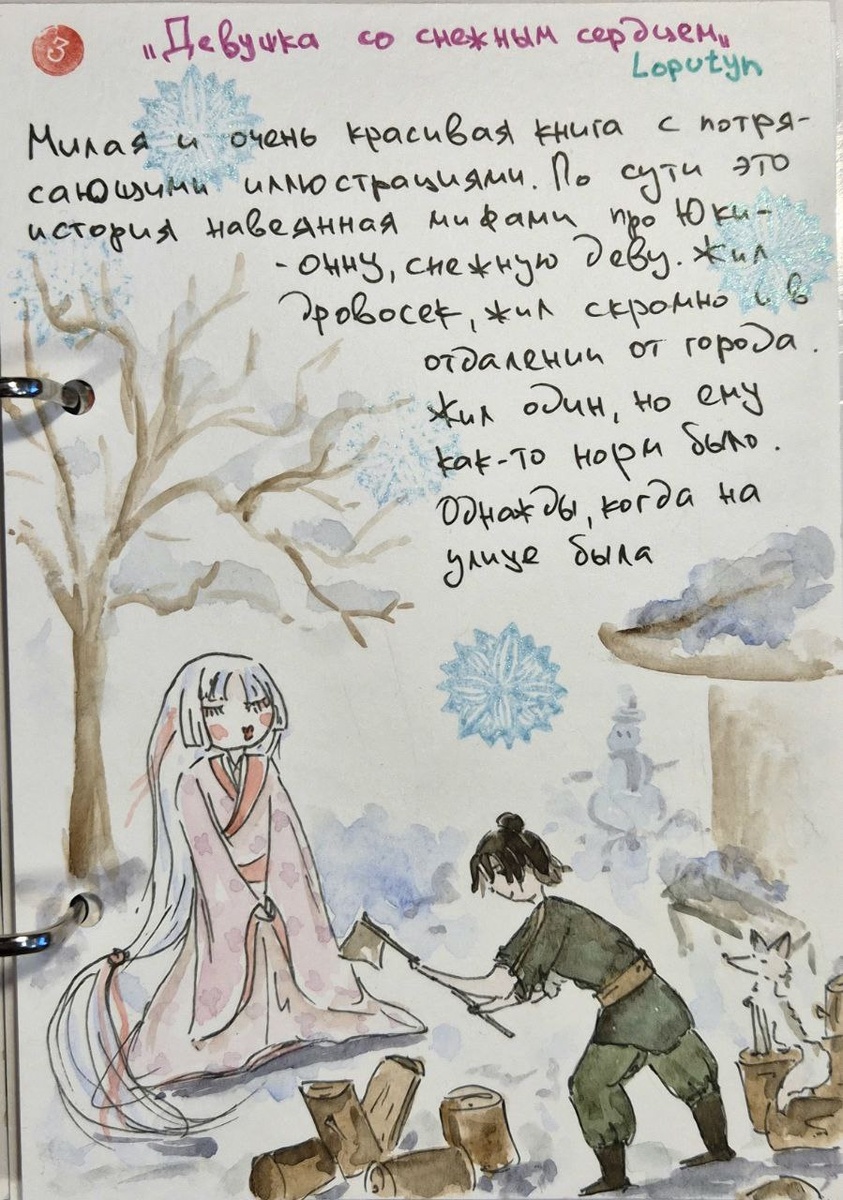 Милая и очень красивая книга с потрясающими иллюстрациями. По сути это история навеянная мифами про Юки-онну, снежную деву. Жил дровосек, жил скромно и в отдалении от города. Жил один, но ему как-то норм было. Однажды, когда на улице была сильная метель, он заметил прекрасную деву. Пожалел и пригласил к себе погреться. В благодарность дева предложила ему свою помощь. Так они и стали жить вместе. Дева была прекрасна, но грустна и чем ближе была весна, тем грустнее она становилась. А ещё она подкармливала лиса, что на деле оказался говорящим духом. Лис уговаривал деву уйти, но она хотела остаться с дровосекам до конца. Дева пришла чтобы сожрать его, но он покорил её своей заботой и она полюбила. Весной, когда природа так прекрасна, девы уже не было с дровосеком. И каждый раз, выходя из дома, он останавливался перед большим деревом, возле которого часто стояла дева, и вспоминал о ней. А рядом всегда сидел лис.