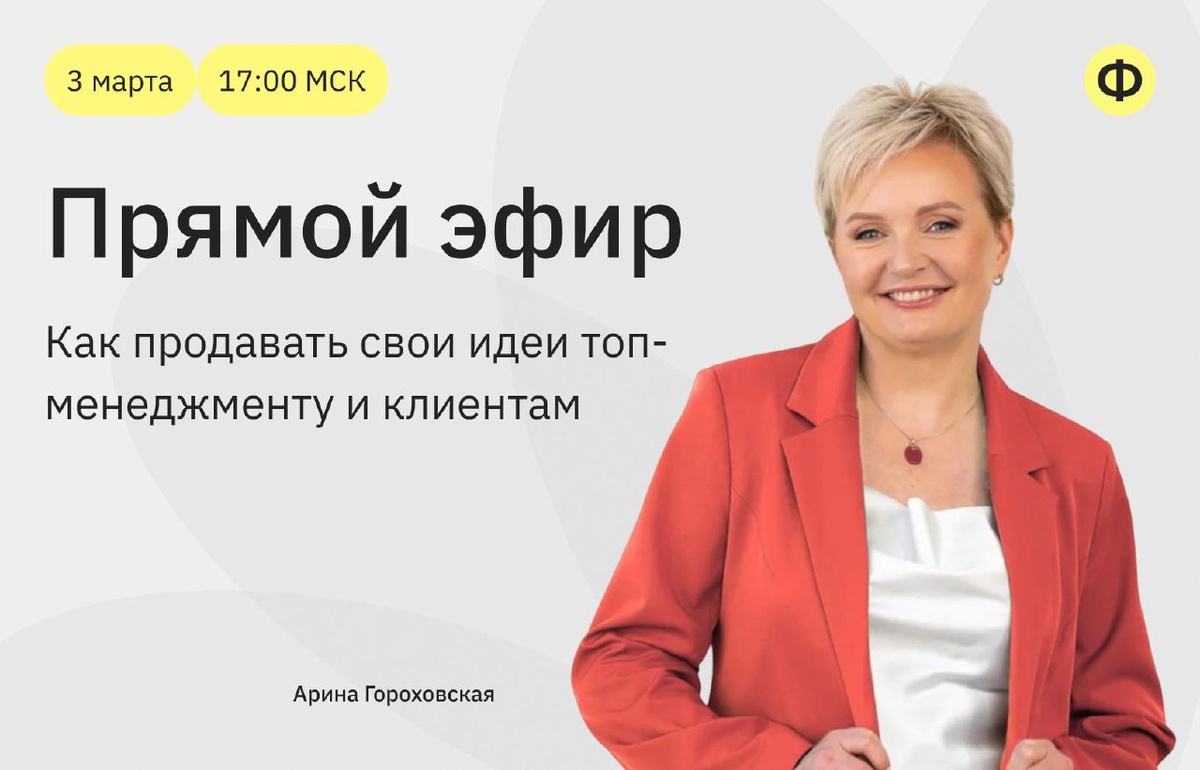 ? Плохая новость в том, что причина неудачи зачастую в том, что вы не смогли правильно её «продать». Есть и хорошая новость — вы можете прокачать способность продавать свои идеи также, как и любой другой навык. Всё дело тут в базовых знаниях психологии, физиологии и риторики. И если вы уже загорелись идеей прокачать свои навыки успешной коммуникации, то наш эфир — то, что доктор прописал. 3 марта в 17:00 МСК встречаемся онлайн с Ариной Гороховской, чтобы освоить секреты влияния на топ-менеджмент и подчинённых. Кто такая Арина Гороховская и почему её стоит слушать? ▫️ Тренер и коуч для лидеров, карьерный консультант; ▫️ эксперт по управлению ответственностью; ▫️ автор книг «Синдром сбитого лётчика. Как не упасть с вершины карьерной лестницы» и «Responsing. Как повысить ответственность подчинённых». За 90 минут разберём: ▫️ Как научиться продавать свои идеи топ-менеджменту и клиентам? ▫️ Какие есть лучшие техники презентации себя на собеседованиях и переговорах? ▫️ Как развить навы