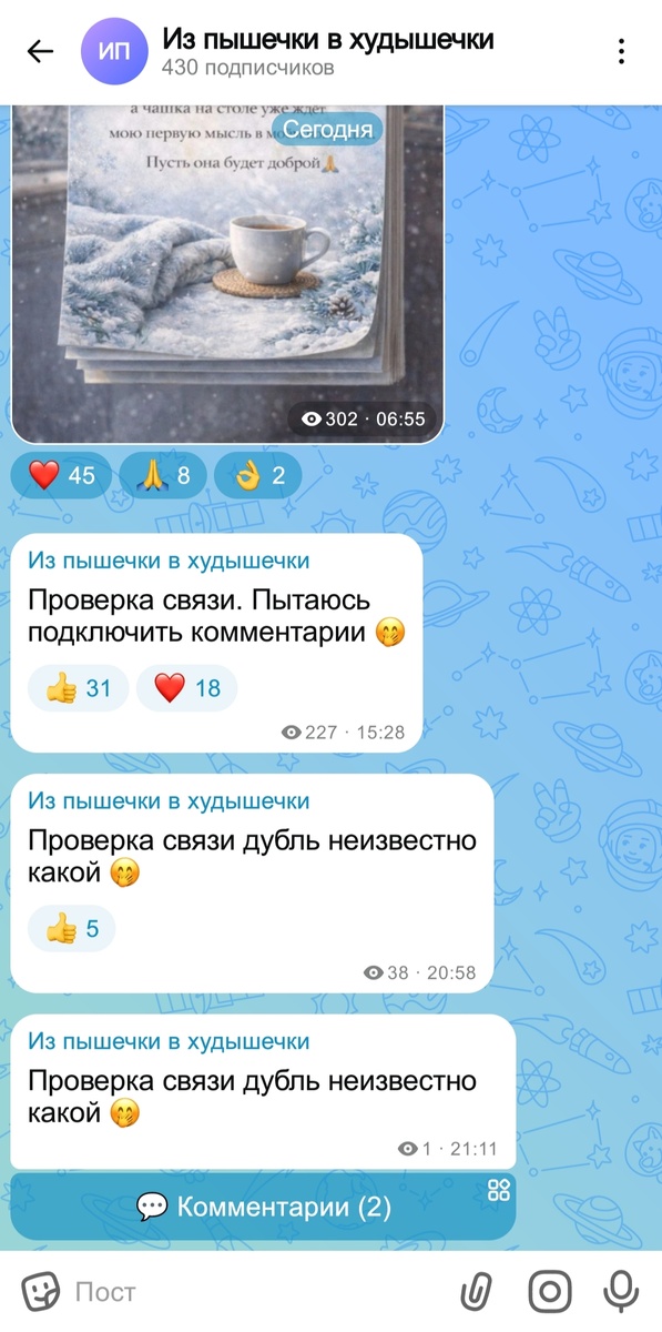 С трёх часов дня и до девяти вечера я разбиралась с подключением бота, через которого теперь можно писать комментарии под постами 🤪 И если бы не помощь моей Настюши, то долго бы я ещё разбиралась, что там и как)