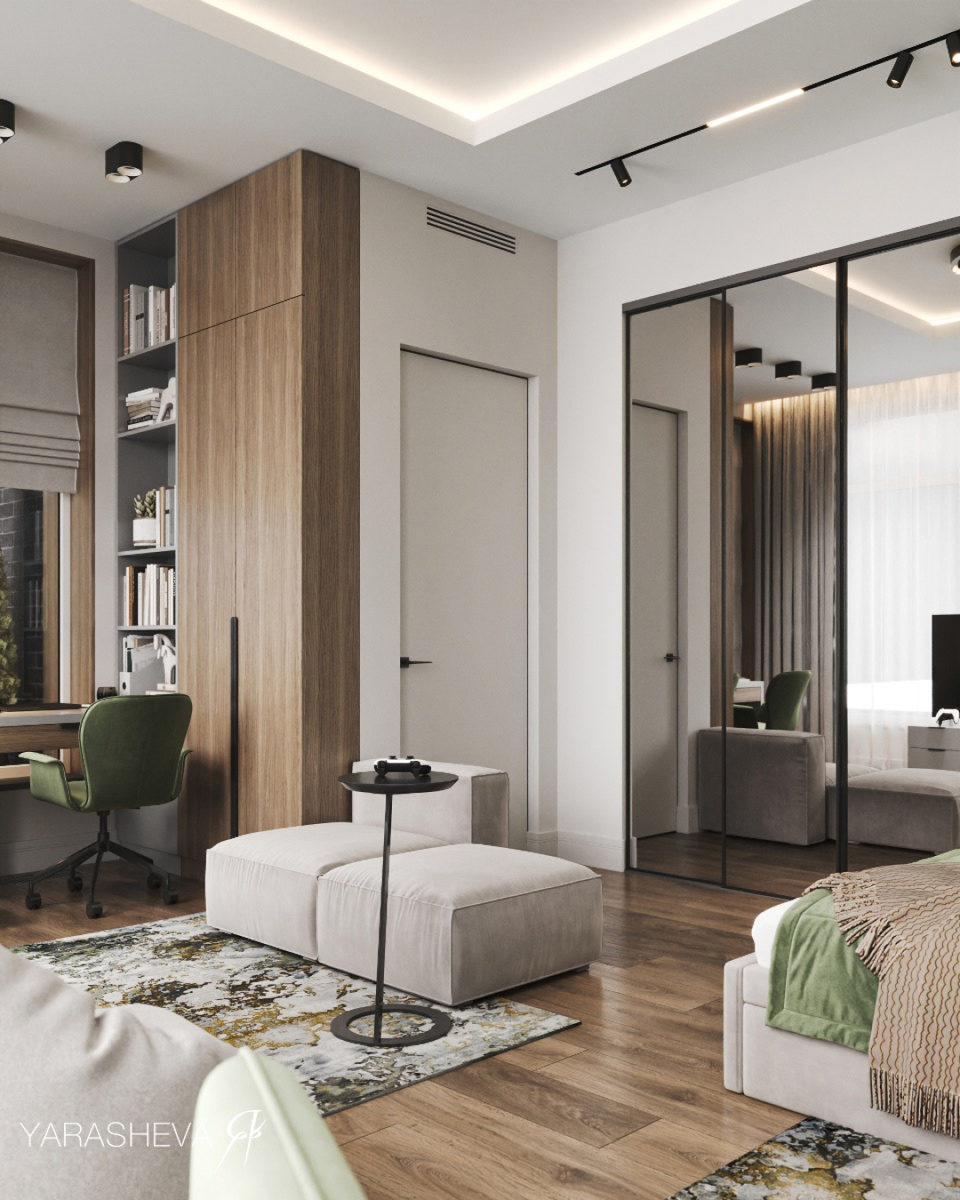 Победитель ADD Awards, номинация «Мастер», приз зрительских симпатий. «Конкуренция была очень высокой — среди участников множество сильных дизайнеров и крупных бюро международного уровня. Потому я и не рассчитывала на победу: радость признания стала ещё ярче и дала новый заряд вдохновения», — делится Яна Ярашева. Этот загородный дом в коттеджном посёлке сделан с любовью к деталям и уважением к природе. В интерьере много дерева разных оттенков — оно добавляет тепла и натуральности. В гостиной крупноформатный керамогранит с рисунком под мрамор в сочетании с деревянными панелями создаёт выразительный акцент и задаёт тон всему пространству. Несколько оттенков зелёного — от насыщенного травяного до мягкого фисташкового — использованы деликатно: они придают глубину и индивидуальность, но не отвлекают, сохраняя спокойный и элегантный характер интерьера. Проект полностью завершён на этапе разработки и подготовки технической документации. Дом с участком сданы и введены в эксплуатацию; сейчас ож