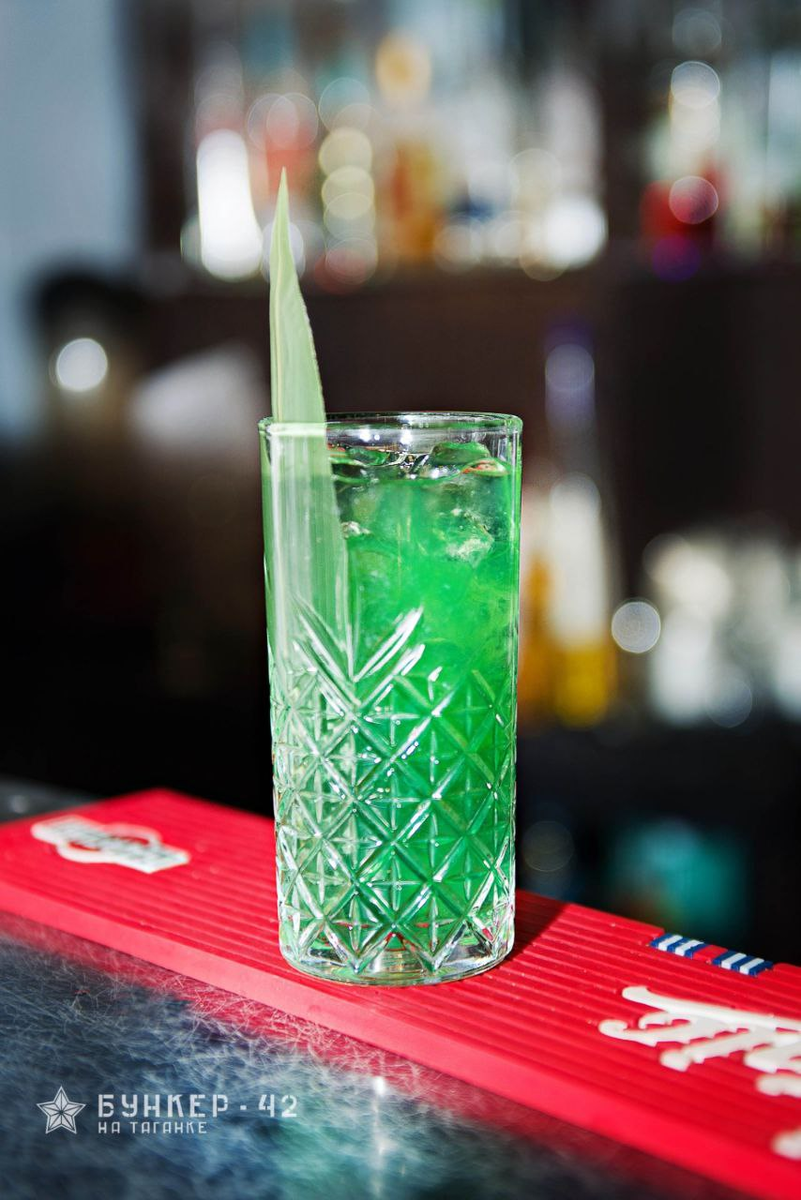 Фирменный коктейль «Бункер-42» — напиток с секретом, как и сам бункер! В его основе сочетание рома, ванильного ликёра «Гальяно», яркого блю курасао и капли абсента. Яблочный сок смягчает вкус и добавляет свежесть Каждый глоток — как путешествие сквозь стальные двери подземного объекта: сначала сладость и лёгкая ваниль, затем цитрусовая волна и неожиданная пряная горчинка