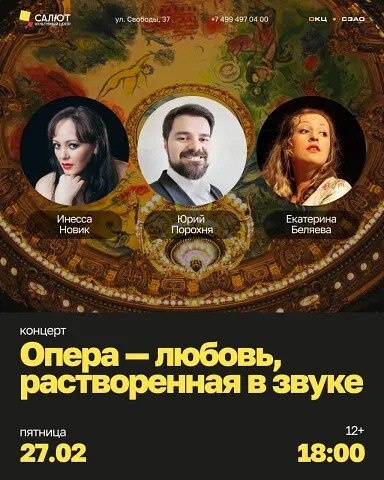 » Если хочется красивого, спокойного и очень душевного вечера, можно заглянуть на камерный вокальный концерт в КЦ «Салют». В программе — оперные арии и романсы о любви, надежде, прощении и чувствах, которые остаются с человеком даже в тишине. 🕑 27 февраля, 18:00 📍 КЦ «Салют», ул. Свободы, 37 💰 Вход свободный 12+ На сцене: 🎙 Инесса Новик — сопрано, лауреат международных конкурсов, выпускница Санкт-Петербургской консерватории им. Римского-Корсакова, солистка Московской государственной капеллы им. В. Судакова 🎙 Юрий Порохня — тенор, лауреат международных конкурсов, солист Московской государственной капеллы им. В. Судакова 🎙 Екатерина Беляева — лауреат международных конкурсов, вокалистка с яркой эмоциональной подачей, первая исполнительница оратории Дмитрия Толстого «Грешница» • WHEREYOUGO Москва | Куда пойти • #фестивали_концерты ❗Висит телега? • Читай наши новости в MAX