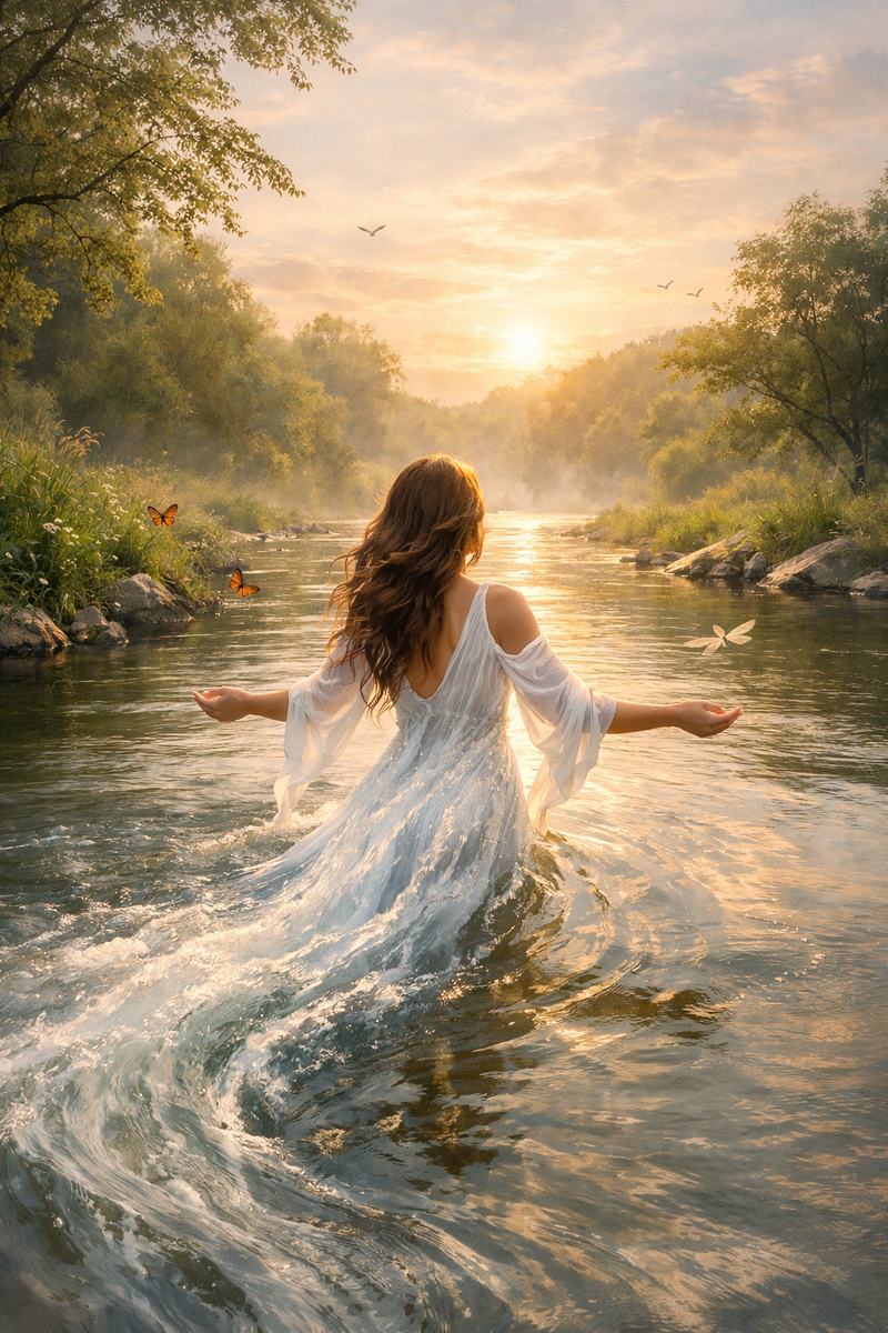 Представьте женщину-реку: её воды текут свободно, питают всё вокруг, но не цепляются за каждый камень на пути. Она мощная, но лёгкая — не борется с течением, а следует ему.