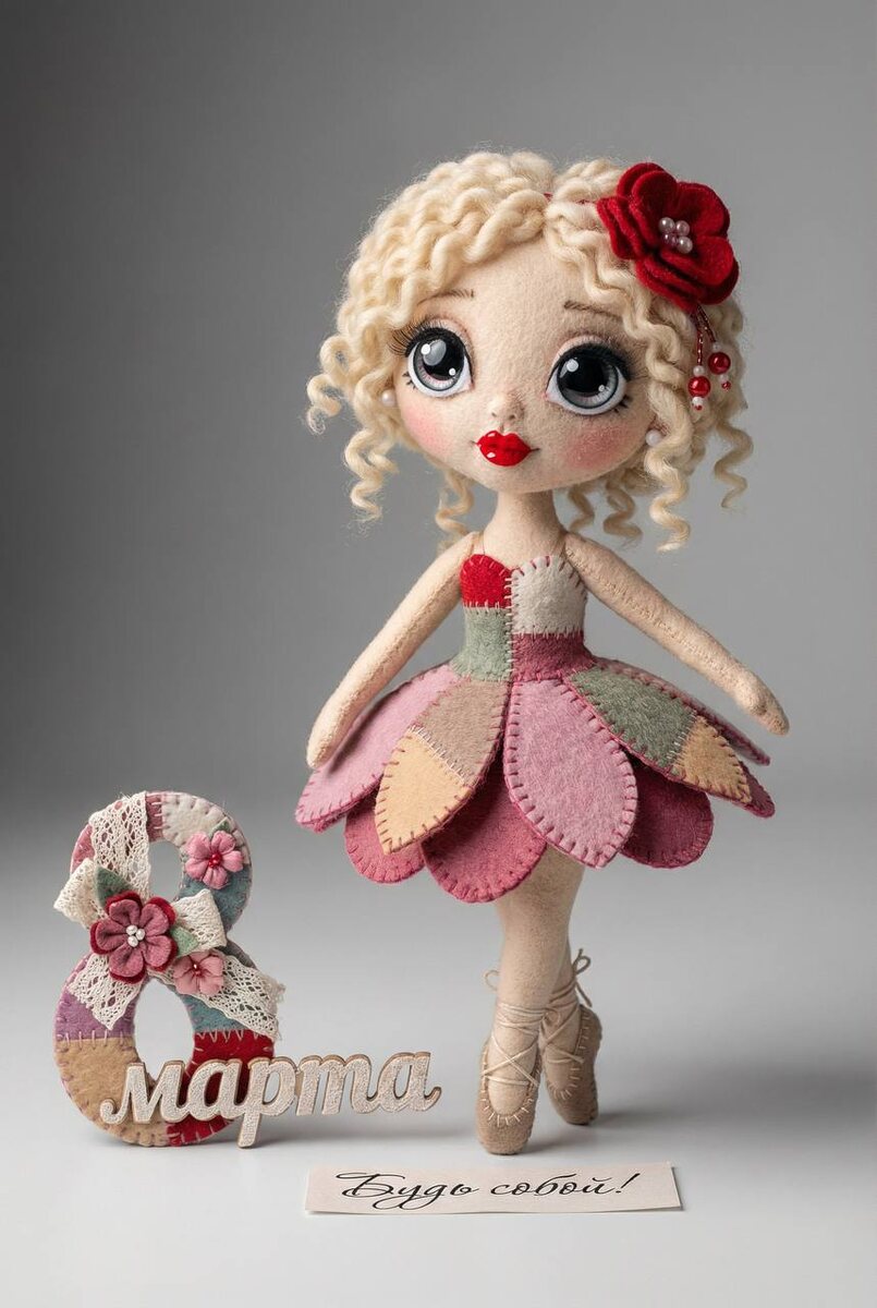ПРОМПТ НА КУКОЛ – 8 МАРТА: 1) Балерина в оранжево‑красном фетре, серый студийный фон Студийная макро‑фотосъемка миниатюрной куклы‑балерины handmade, большая голова, огромные глянцевые глаза, ярко‑красные губы, светлые локоны из шерстяной пряжи, сбоку красный текстильный цветок с бусинами. Платье из плотного фетра и пэчворка, многослойная юбка‑лепестки с толстыми краями, видимые стежки, тонкие ноги в пуантах со шнуровкой, поза на носке как в танце. Фон нейтральный серый градиент, малая глубина резкости, мягкий рассеянный свет, реалистичная фактура войлока и нитей. Слева в кадре объемная надпись «8 марта» собрана из кружевных лент, маленьких тканевых цветов и пэчворк‑кусочков, легкая тень на фоне. Внизу по центру подпись каллиграфическим шрифтом «Будь собой!» как чернильный леттеринг на тонкой бумажной полоске. ultra detailed, handcrafted felt texture, no CGI gloss, no plastic look. Постановочная съемка куклы‑балерины в стиле handmade toy couture, тело миниатюрное, голова крупная, волосы