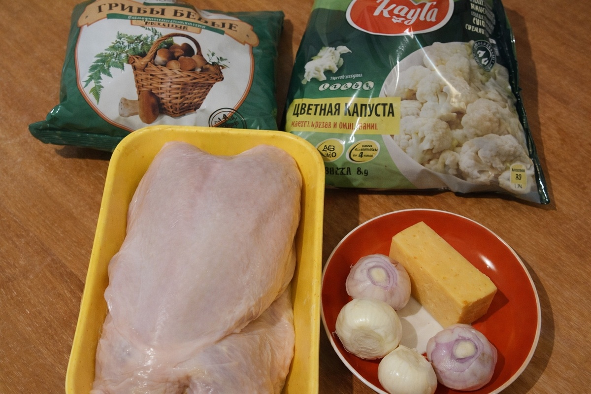 Продолжая рубрику Дачные рецепты, приготовим запеканку с грибами. Этим блюдом, вкусным и полезным, можно не только поужинать обычным вечером, но и подать его на праздничный стол. Продукты, из которых мы будем готовить запеканку с грибами: грибы белые; куриная грудка; цветная капуста; лук, чеснок; свежие помидоры; сметана, твёрдый сыр, соевый соус, приправа. Закинуть автору на продукты можно здесь. Куриную грудку освободим от кожи и мелко порежем. Нарежем лук, обжарим его на оливковом масле до золотистого цвета. Добавим на сковородку белые грибы, посолим, поперчим и пожарим ещё минут 10. Сварим цветную капусту, посолим, добавим немного приправы и откинем на дуршлаг. Куриную грудку обваляем в панировочных сухарях и обжарим на оливковом масле. За 2 минуты до готовности добавим раздавленный под прессом чеснок и немного соевого соуса. В форму для выпечки выкладываем слоями грибы, капусту, куриную грудку. Нарежем помидоры кольцами и уложим на курицу. Сверху польём сметаной, посыплем тёрт