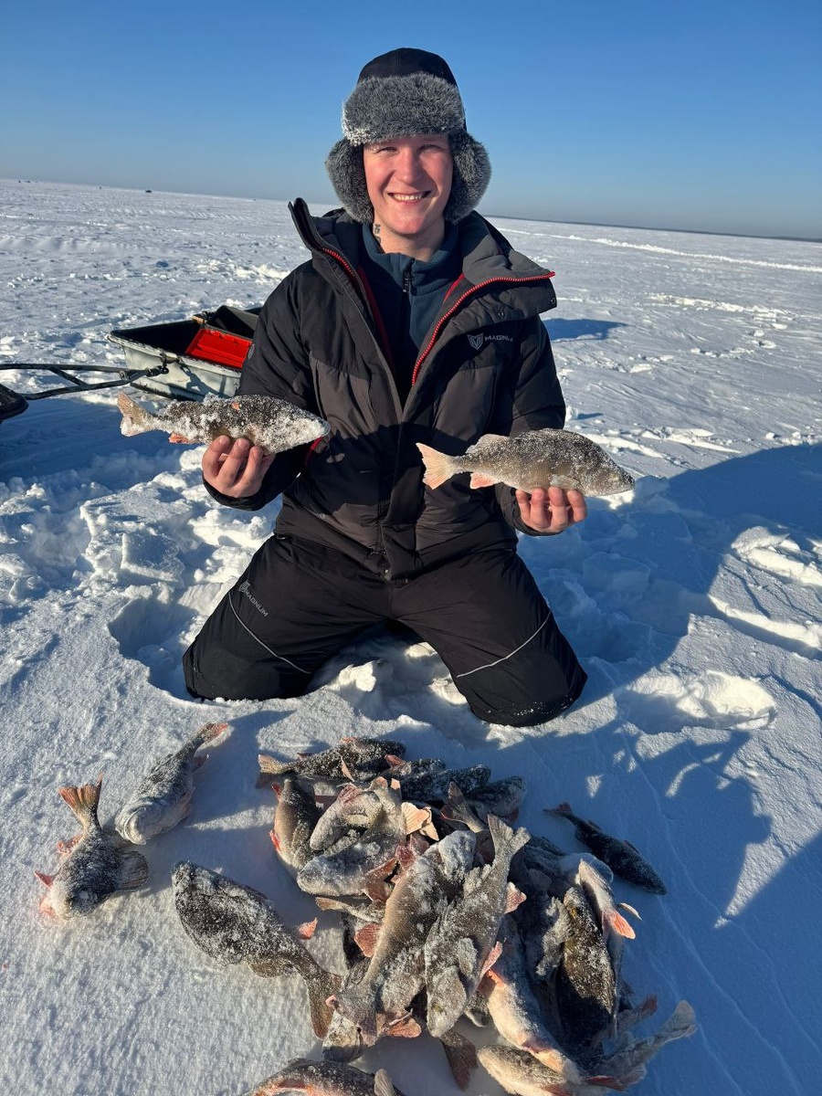 После вчерашнего снегопада все же решились выехать — проверить, как там поживает окунь. Погода выдалась шикарная: утром бодрый морозец, а ближе к обеду солнце так припекло, что стало совсем тепло. Рыбу нашли не сразу — около полутора часов бегал, словно в пустой ванне. Сначала ловили в толпе. Сразу заметил одного мужичка, который уж очень активно работал руками, хотя вокруг у всех был полный ноль 😁 Саня решил остаться, а я запрыгнул в собачку и отъехал метров на 100 за мужика. Там взял первые четыре окуня — и тишина. Пока Саня подходил, даже поклевки не увидел. Сместились ещё на сотню метров, остановились у заломчика. Лед по самый адаптер. Опускаю блесну, не опускается. Думаю, шуги много. А нет… Окунь уже сидит - мордатый. Сразу пошла неплохая раздача — 19 штук в темп! Потом пробежался, взял ещё пять с двух лунок и сказка закончилась. Едем дальше, снова метров сто вперёд. Нашёл пятак, поймал ещё семь, было три схода. На третьем сходе леска не выдержала, кто-то очень тяжелый был. Н
