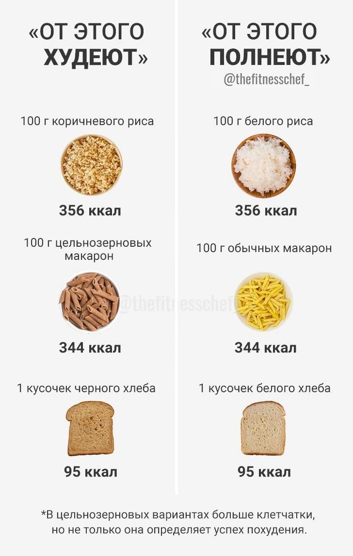 - то же самое с макаронами - цельнозерновые и обычные могут быть очень близки по килокалориям на 100 г сухого продукта;