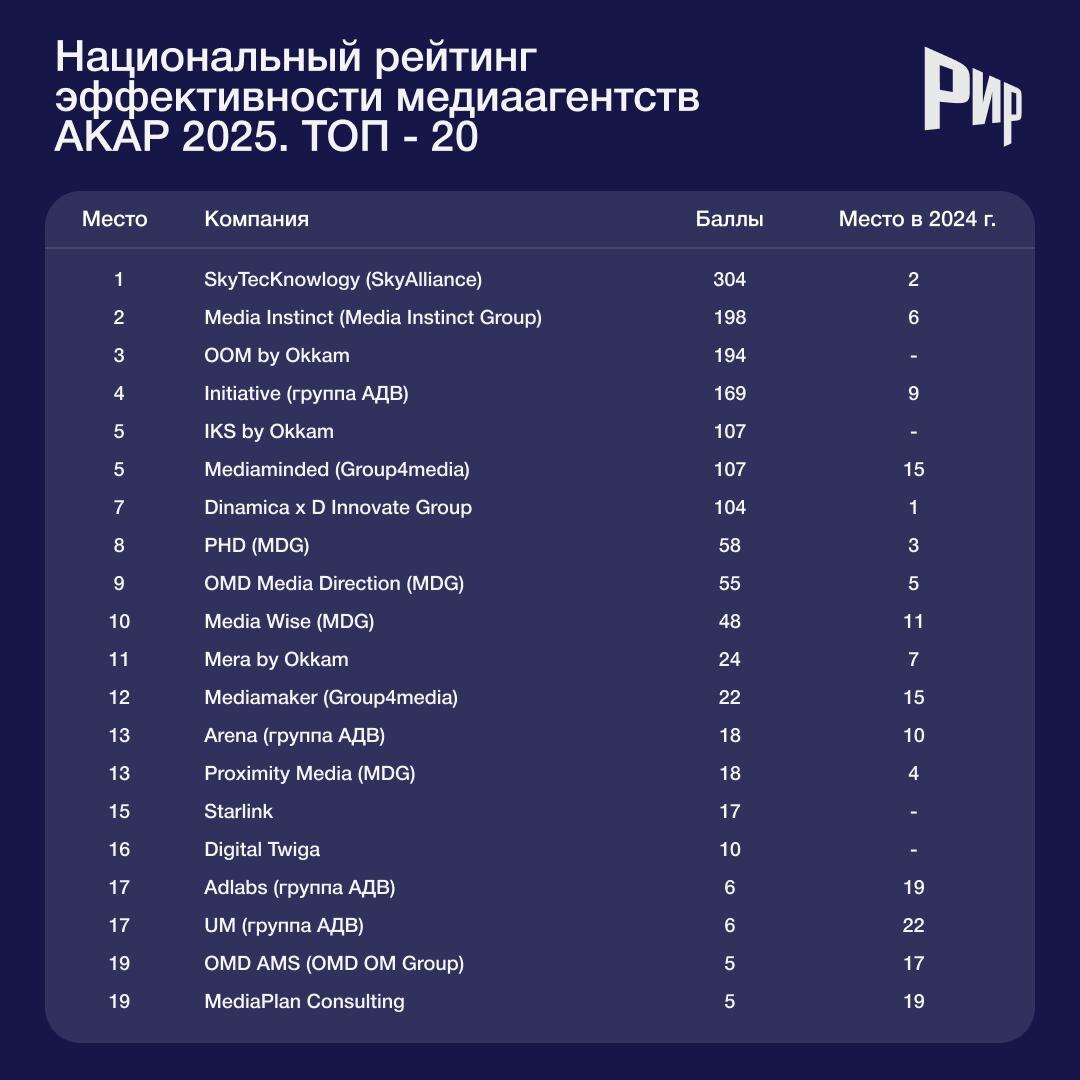 Топ-20 лидеров: 🥇 SkyTecKnowlogy (SkyAlliance) 🥈 Media Instinct (Media Instinct Group) 🥉 OOM by Okkam 4 Initiative (группа АДВ) 5 IKS by Okkam 5 Mediaminded (Group4media) 7 Dinamica x D Innovate Group 8 PHD (MDG) 9 OMD Media Direction (MDG) 10 Media Wise (MDG) 11 Mera by Okkam 12 Mediamaker (Group4media) 13 Arena (группа АДВ) 13 Proximity Media (MDG) 15 Starlink 16 Digital Twiga 17 Adlabs (группа АДВ) 17 UM (группа АДВ) 19 OMD AMS (OMD OM Group) 19 MediaPlan Consulting 🌟 Подробнее — на сайте 🔜 РИР — чтобы быть в курсе