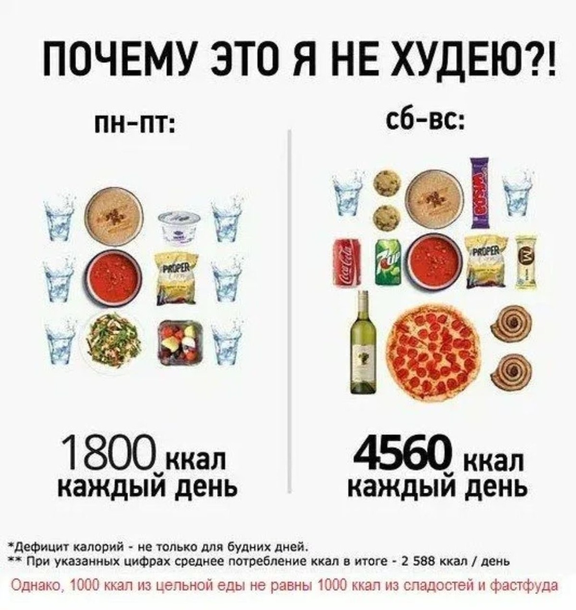 А потом наступают выходные. И там не “я испортила всё”, а просто математика: пицца, сладкое, напитки, перекусы “чуть-чуть”, бокал вина, ещё один. В итоге 1-2 дня легко добавляют столько килокалорий, что средняя энергия за