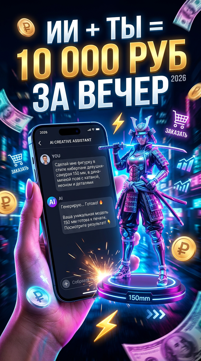 Привет! Это команда SmolArt. Вчера я потратил 4 часа и заработал 22 000 руб. чистыми — без ZBrush, без 3D-скульптинга и без найма художника. Всё сделал ИИ + 16K resin-принтер. Сегодня покажу тебе точный процесс, который сейчас приносит мне 80–150 тыс. в месяц на кастомах и миниатюрах. Всё с цифрами, промптами и реальными продажами. Шаг 1. Идея и генерация (30–90 секунд)