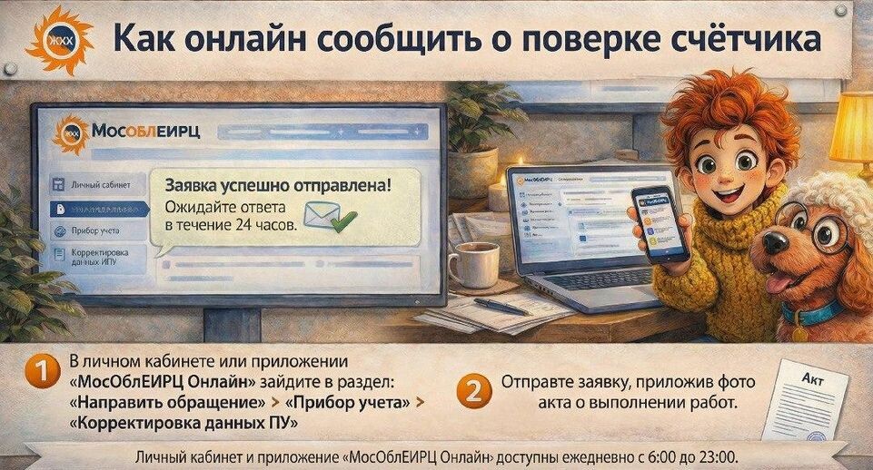 После поверки, установки или замены прибора учета важно поставить в известностьоб этом расчетный центр или управляющую компанию, сообщает пресс-служба корпоративных коммуникаций МосОблЕИРЦ. Клиенты МособлЕИРЦ могут сделать это онлайн, не посещая офис. • В личном кабинете или в приложении «МосОблЕИРЦ Онлайн» зайдите в раздел «Направить обращение» — «Прибор учета» — «Корректировка данных ПУ» • Отправьте заявку, приложив фото акта о выполнении работ. Если в вашем личном кабинете прикреплено несколько лицевых счетов, укажите тот адрес, где проводилась поверка либо установка. Срок ответа на обращение — не более 24 часов. Информация о счетчике обновится в личном кабинете в течение месяца. В это время при необходимости передать показания можно в личном кабинете в разделе «Отправить обращение» — «Показания приборов учета» — «Показания после поверки». Если пропустить период приема показаний, плату начислят по среднемесячному объему или по нормативу. После передачи показаний будет выполнен перер