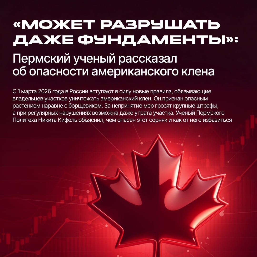 ». Американский клен (он же ясенелистный) официально признан опасным инвазивным видом — наравне с борщевиком. Теперь владельцы участков обязаны его уничтожать. Если не принять меры, можно получить крупный штраф, а при систематических нарушениях — лишиться земли. Но почему вокруг этого дерева столько шума? Ученый Пермского Политеха Никита Кифель объяснил URA.RU, чем американский клен так опасен — смотрите в карточках. Подробнее — на нашем сайте. ❤️ Подписаться | Предложить новость | Дать «буст» | Мы в MAX