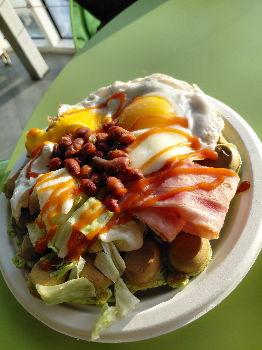 Корнер «Vaffel» недавно заимел новую жизнь в Фуд-парке ТРК «Норд» на севере Санкт-Петербурга. Мне всегда их вафли казались сладкими и часто неуместными в сытном исполнении, но моей супруге всегда нравились, а я, как и полагается влюбленному мужу, просто соглашаюсь на завтрак поесть вафли. А я ведь и не пробовал их завтраки. При заказе произошло что-то странное. В чат можно добавить кофе, то есть, например, к «английскому завтраку» можно попросить кофе. Но девушка за терминалом сказала нам, что американо попросить нельзя. (Что?) Это самое странное предложение... К завтраку нельзя добавить американо при опции «блюдо + кофе». Но нам повезло! Девушка сказала, что для нас сделает американо! Вот это нам повезло! Что произошло? Прощаем, суббота утро, все понимаю, все простительно. Кстати на сайте таких предложений нет вообще. ЯИЧНИЦА С БЕКОНОМ (460р.) Увесистая, но неподходящая для блюда тарелка. Всё сыпется и выглядит неаккуратно. Но на тарелке мы видим хороший, сочный набор. Яйца, бекон, са