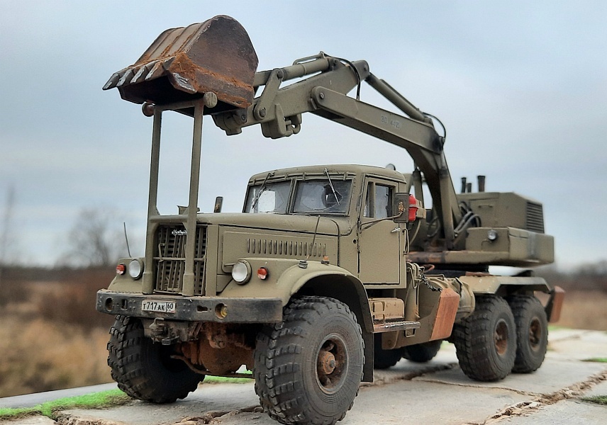 Единственное,что я сделал,это полностью разобрал,снял краску.Покрасил аэрографом и краской xf49.Счистил металлические поручни,ручки,повторители на крыльях.Сделал имитацию вмятин на крыше и правой двери,ну и немного по краям.Просверлил отверстия для ручек,заново выточил из проволоки.Поставил фототравление: рамки окон,элементы боковины,решётку радиатора.Приделал усы на крылья.Заменил всю оптику на Три А.Поменял резину с дисками,поставил харьковские.Расширил переднюю колею.Заново сделал ресиверы,трубки к ним.Подножки,ящики.Провел имитацию топливных трубок и гидравлических к лапам.Повесил цепи для их держания.Провёл гидрошланги к штокам установки.Сделал дверцы,ручки.На скворечнике решил сделать открывающуюся дверь.Для начала канцелярским ножом аккуратно отрезал её, из банки металической сделал что то похожее на петли,хотя это у меня не получилось от слова совсем...Заново из тонкого прозрачного пластика сделал остекление.Рабочее место спилил,ибо кресло там монолитное и слишком не правдоподобное.Пол сделан из пластика,перенесен блок управления,из проволоки сделаны рычаги.Сидение сделано из пластика и проволоки,обтянуто бумагой.Добавлены педали,канистра,бутылка.Трос.Запасное колесо решил сделать стёртым.Когда то в свое время у меня на КаМаЗ 4310 именно такое и стояло" не вовремя поменяные шкворня сделали свое дело на передке" Спилил на раме лебедку,балку передвинул,добавил доски,трос и канистру