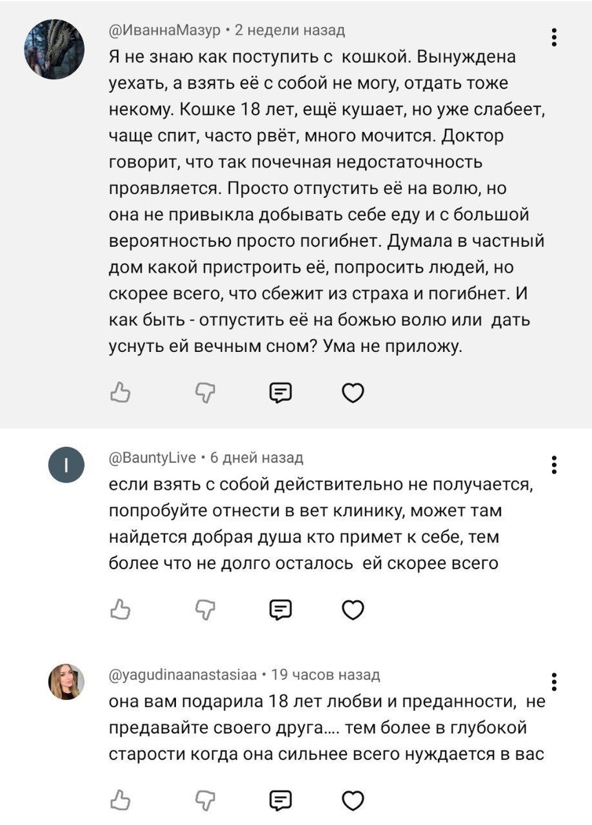 Такие разные люди. Для кого-то кошка вещь, для кого-то живое существо. Для кого-то ответственность за жизнь - это не просто слово. Кто-то совершено спокойно размышляет - выгнать или усыпить. Люди, которые избавляются от кошек, когда они болеют и стареют, может и не люди вовсе. Может быть и правильно, если от них в свое время тоже избавятся дети.