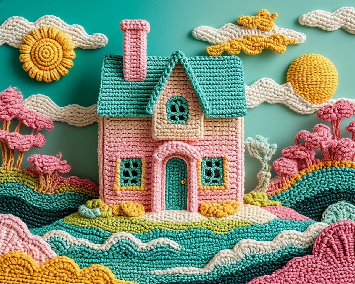 Вот так мне ответила одна моя подруга, когда я ей привезла в подарок свою вышивку. Я так обиделась сначала, а она меня обняла и говорит: "Я же теперь только о таком мечтать буду каждый день! ВОт повешу на стену в рамочку и буду визуализировать )))))))". Представляете?! Прошло пару лет и моя подружаня построила себе вот прям такой же домик, как я ей вышивку делала! Так что, энергия наших творений и вера в себя, творят чудеса! Ой, друзья, понесло меня в вязанные дали )))) Не могу остановиться! Хочу теперь такие домики! Пишите в комментарии, смогли бы такие связать самостоятельно? В конце, по традиции, промт Промт: вязанные макраме 3d сюрреализм нежно бирюзовый, зеленый, желтый, розовый, молочный, темные узоры, абстрактно +тряпичный домик для куклы, на фоне вязанного моря, неба и солнышка И ещё в других цветах: А вот и промт: вязанные макраме 3d сюрреализм абстрактно +тряпичный домик для куклы, на фоне вязанного моря, неба и солнышка, пэчворк, Огромный выпуклый вязанный мир с эффектом гл
