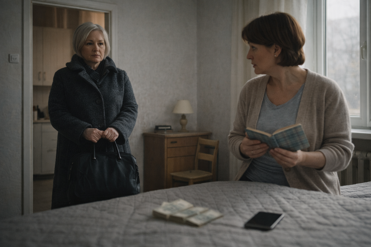 В руках у неё была тетрадь — в клетку, с обтрёпанным уголком. Купюры лежали на покрывале — ровной стопкой, аккуратно, как будто их уже пересчитали.
