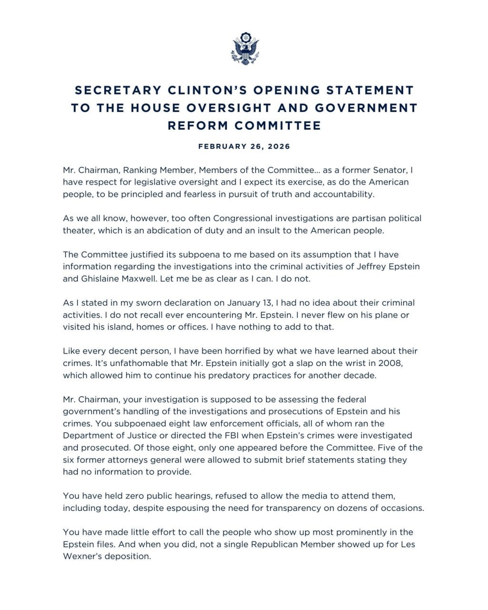 Hillary Clinton deposition on Epstein ties UNDERWAY