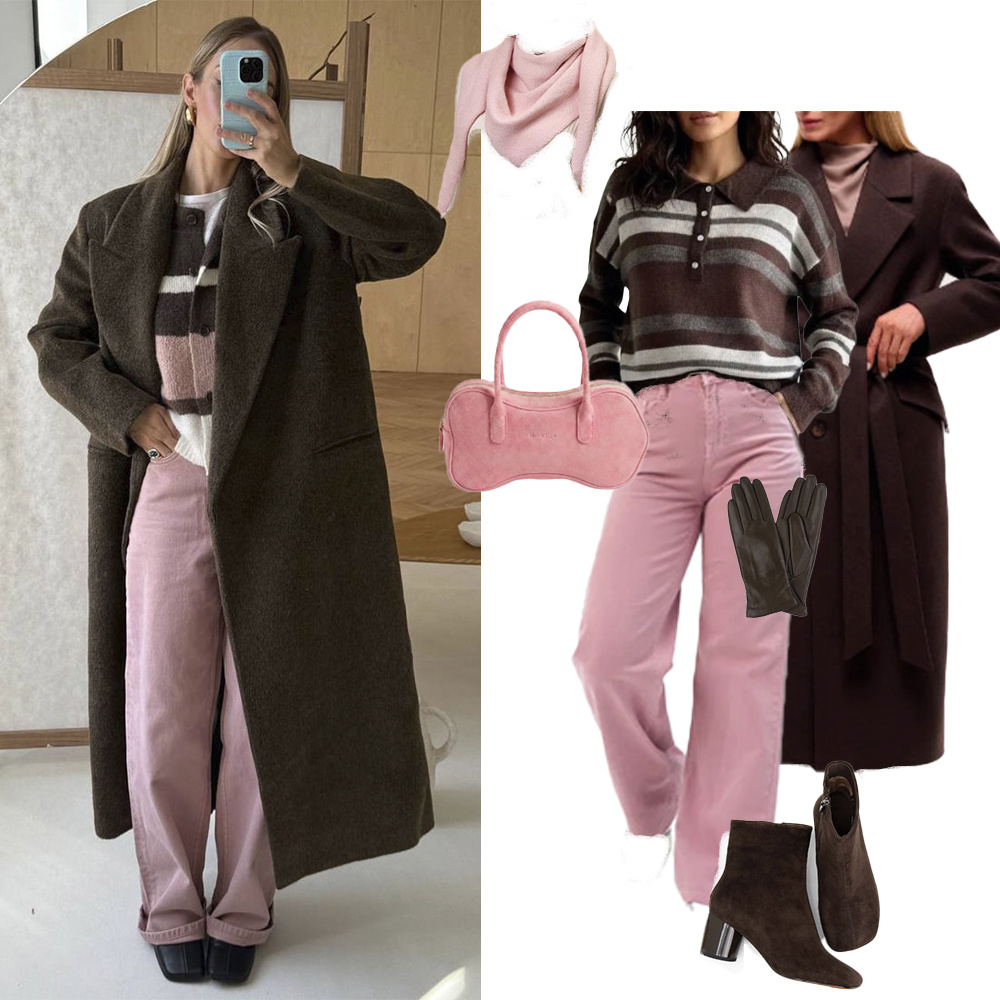 Уже послезавтра весна, а у меня поднакопились интересные идеи образов с Pinterest, аналоги которых я собрала на Wildberries. Да, не всегда образы с Пинтерест такие, что прям бери и собирай один - в -один: там или обувь не по сезону, или шапки - перчаток не хватает и еще всякие нюансы. Однако, это даже и хорошо. Я использую идеи для вдохновения, иногда даже покупать новое не нужно, можно из уже того, что имеется в гардеробе, собрать что-то новое. Ваш гардероб я не знаю, поэтому похожие образы собрала полностью с артикулами. Образ 1. Зайду с козырей: одного из самых модных сочетаний грядущего сезона- розового с коричневым и трендового цветного денима. Тёмный низ и более светлый верх- это неплохо, но если наоборот, то интереснее, поэтому внизу у нас розовые джинсы, а вверху коричневые пальто и поло в полоску. Кардиган похожий не нашёлся, но поло здесь смотрится не хуже. Обувь мне захотелось не черную, как в исходнике, а коричневую - так гармоничнее. В оригинале нет головного убора, шарфа,