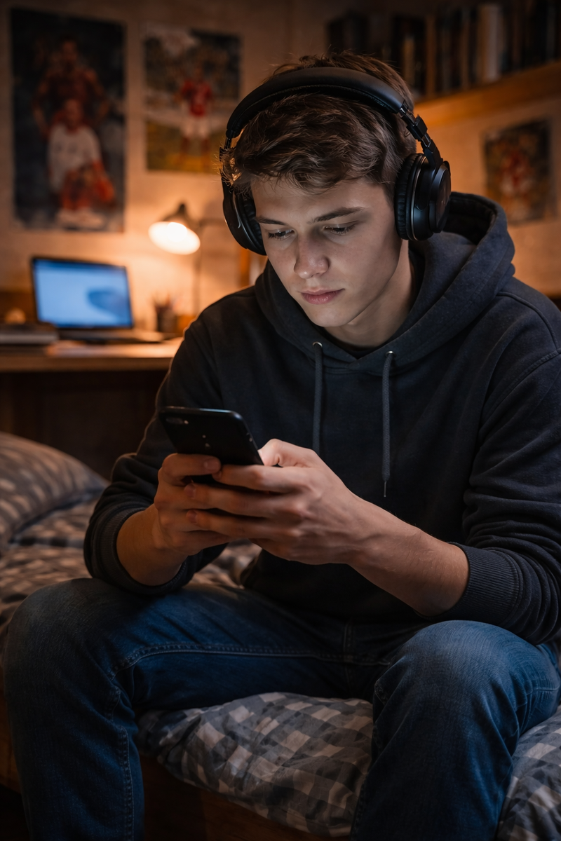Он сидел за столом, в наушниках. Экран телефона светился голубым. Лицо — какое-то чужое.