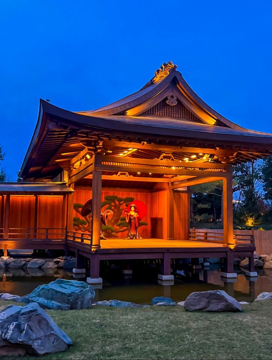 🪭 能楽堂 🎭 Драматический театр Но – один из трёх популярных видов театров классической танцевальной драмы в Японии. Здание выполнено в традиционном японском стиле с использованием элементов художественного декора. Состоит из парящей над водной гладью основной сцены (хонбут), моста (хасигагари), задней сцены (атодза) и мест для исполнителей (дзиутаидза). Изображение сосны на стене кагамиита символизирует жизненный цикл человека и его вечное стремление к счастью. ✨✨🌺✨✨ 📷zaytova_art 4️⃣5️⃣5️⃣5️⃣ 💜 Японский сад в MAX 🛩Японский сад | Подписаться