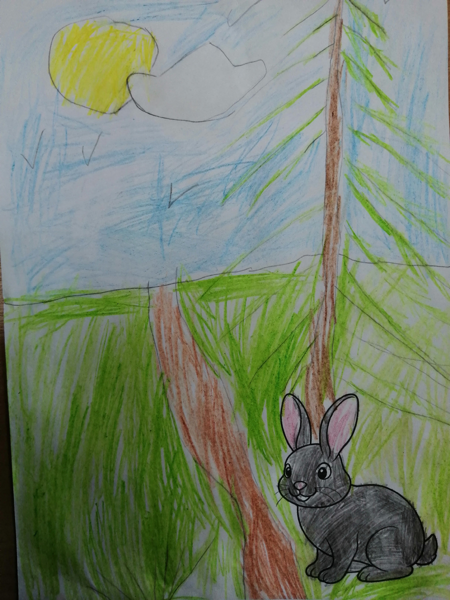 Описание: "Осенью в школе проходил классный час, посвященный творчеству Н. Рубцова. На конкурсе чтецов я читал стихотворение «Про зайца». Оно мне очень быстро запомнилось. Я представил трусливого зайчонка и нарисовал его карандашами".