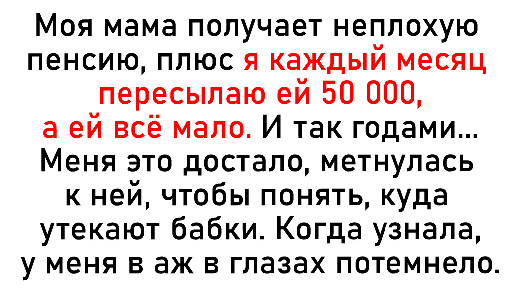 Моя мама получает неплохую пенсию, плюс я каждый месяц пересылаю ей 50 000, а ей все мало. И так годами. Меня это достало, метнулась к ней, чтобы понять, куда утекают бабки. Когда узнала, у меня в аж в глазах потемнело. Оказалось, моя мать дает деньги хитрым родственничкам, которые смекнули, что они у нее есть. То одной надо срочно операцию делать, то другой сыночке-корзиночке квартиру в чужом городе снять, потому что ее мальчик в общаге не проживет, то третьему не хватает на тачку получше. И никто деньги не отдает, а мама и не ждет: «Ну нет у человека у возможности». Зато у меня, получается, есть возможность содержать этих прихлебателей! При этом мама звонила мне и жаловалась: не хватает на лекарство, надо бы колонку поменять и так далее. Да она давно могла всю квартиру обновить и скупить половину какой-то аптеки!