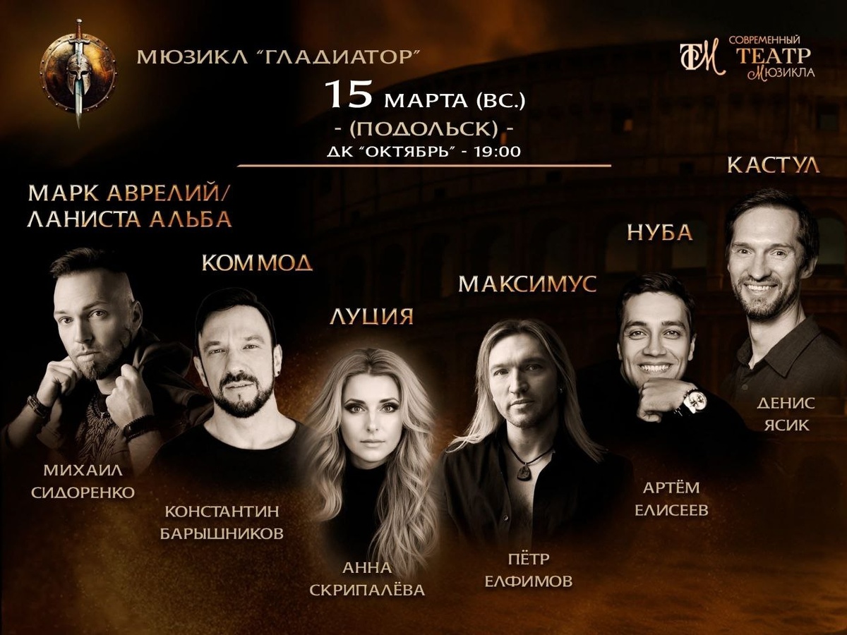 Друзья, следующие показы рок-мюзикла «Гладиатор» с Петром в роли Максимуса пройдут в Подольске и Санкт-Петербурге совсем скоро