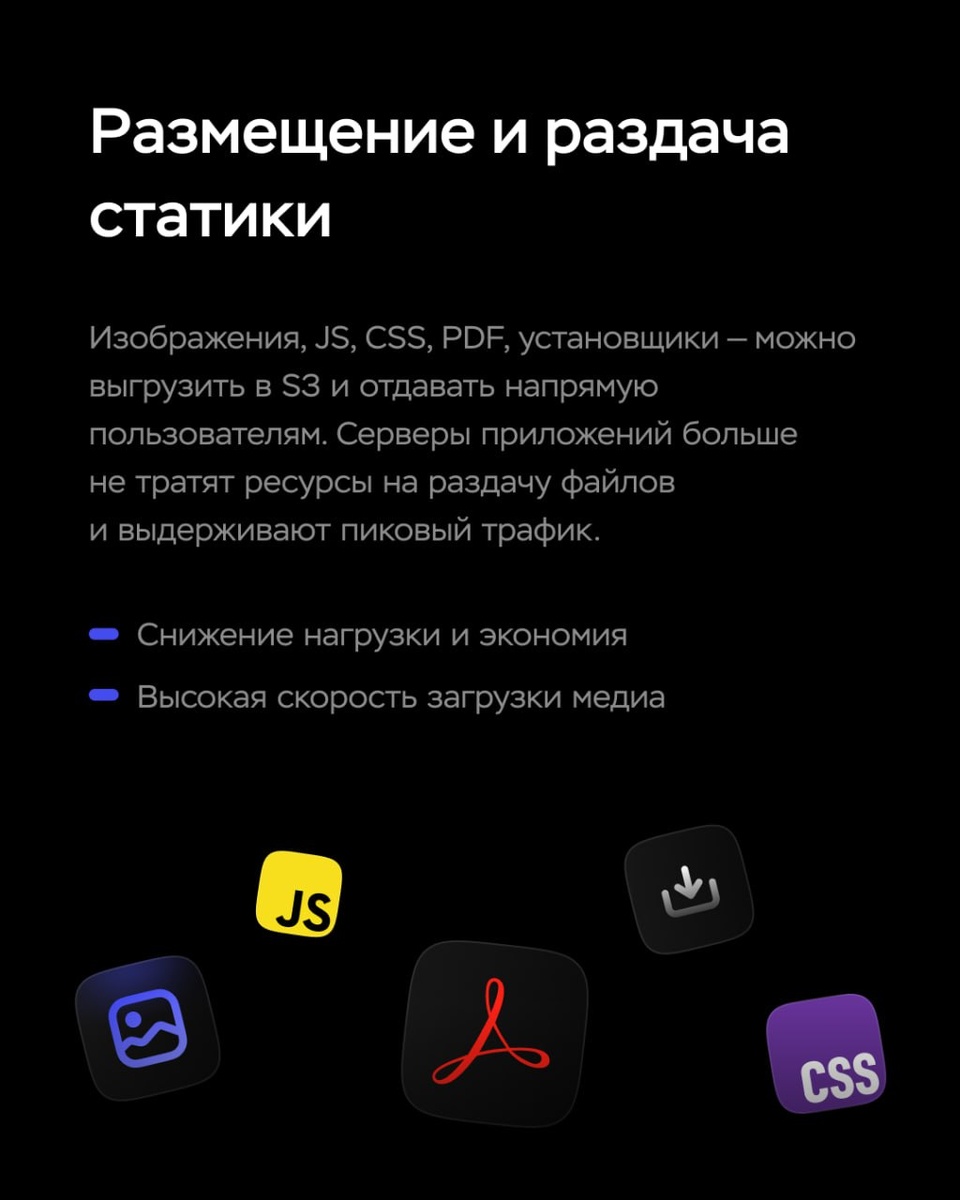 ✔️ Начать пользоваться хранилищем S3 Бэкапы, пользовательский контент, ML-датасеты и архивы — проще загружать в S3, чем разворачивать собственную инфру. Пять сценариев в карточках 👆🏻 После прочтения поста предлагаем либо заводить свое хранилище, либо написать в комментах, как вы уже его используете.